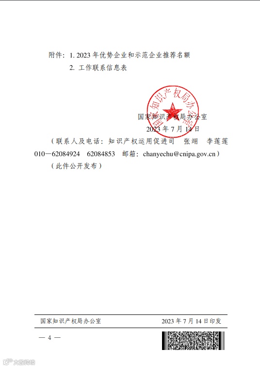 附件:1.国家知识产权局办公室关于面向企业开展2023年度知识产权强国建设示范工作的通知(国知办函运字〔2023〕572号)