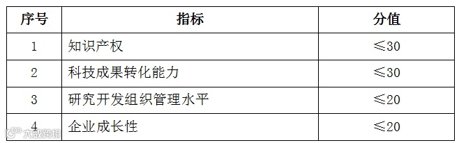 企业创新能力主要从知识产权、科技成果转化能力、研究开发组织管理水平、企业成长性等四项指标进行评价。各级指标均按整数打分,满分为100分,综合得分达到70分以上(不含70分)为符合认定要求。