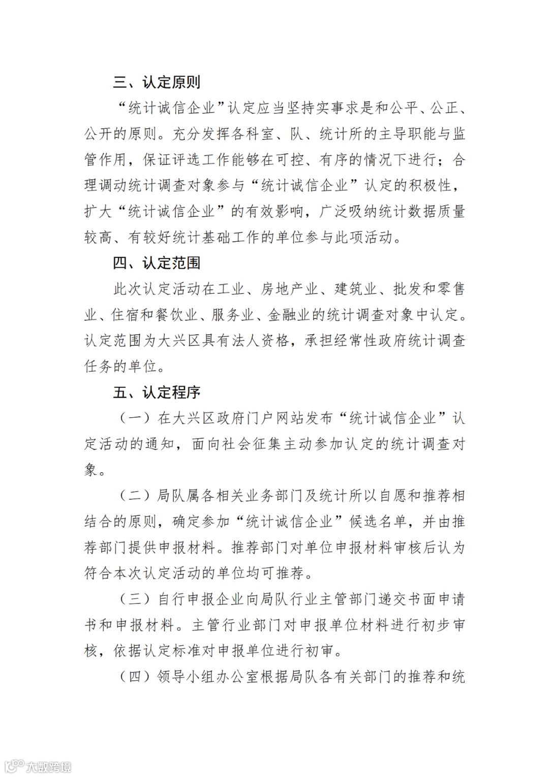 (一)此次认定活动在工业、房地产业、建筑业、批发和零售业、住宿和餐饮业、服务业、金融业的统计调查单位中开展,评选范围为大兴区具有法人资格,承担经常性政府统计调查任务的单位。