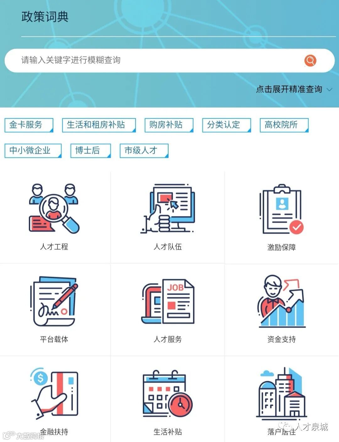 人才政策电子词典采集汇总了国家、省、市、区四级人才政策,按照人才工程、人才队伍、激励保障、平台载体、人才服务、资金支持、金融扶持、生活补贴、落户居住9个方面,划分学历、称号、区域、职称等不同维度,分类汇总重点人才政策共156条,并详细公布每项政策的适用对象、政策内容、申报条件、主管部门、咨询电话等信息,便于人才快速查询、精准使用,为推动各级各类人才政策充分推介、有效落地。