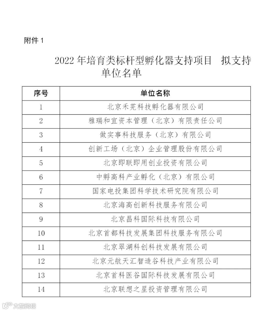 按照《中关村国家自主示范区促进园区高质量发展支持资金管理办法(试行)》(京科发〔2022〕7号),经有关程序,现将2022年培育类标杆型孵化器支持项目和创业服务机构绩效考核后补贴项目拟支持单位名单(详见附件)予以公示。