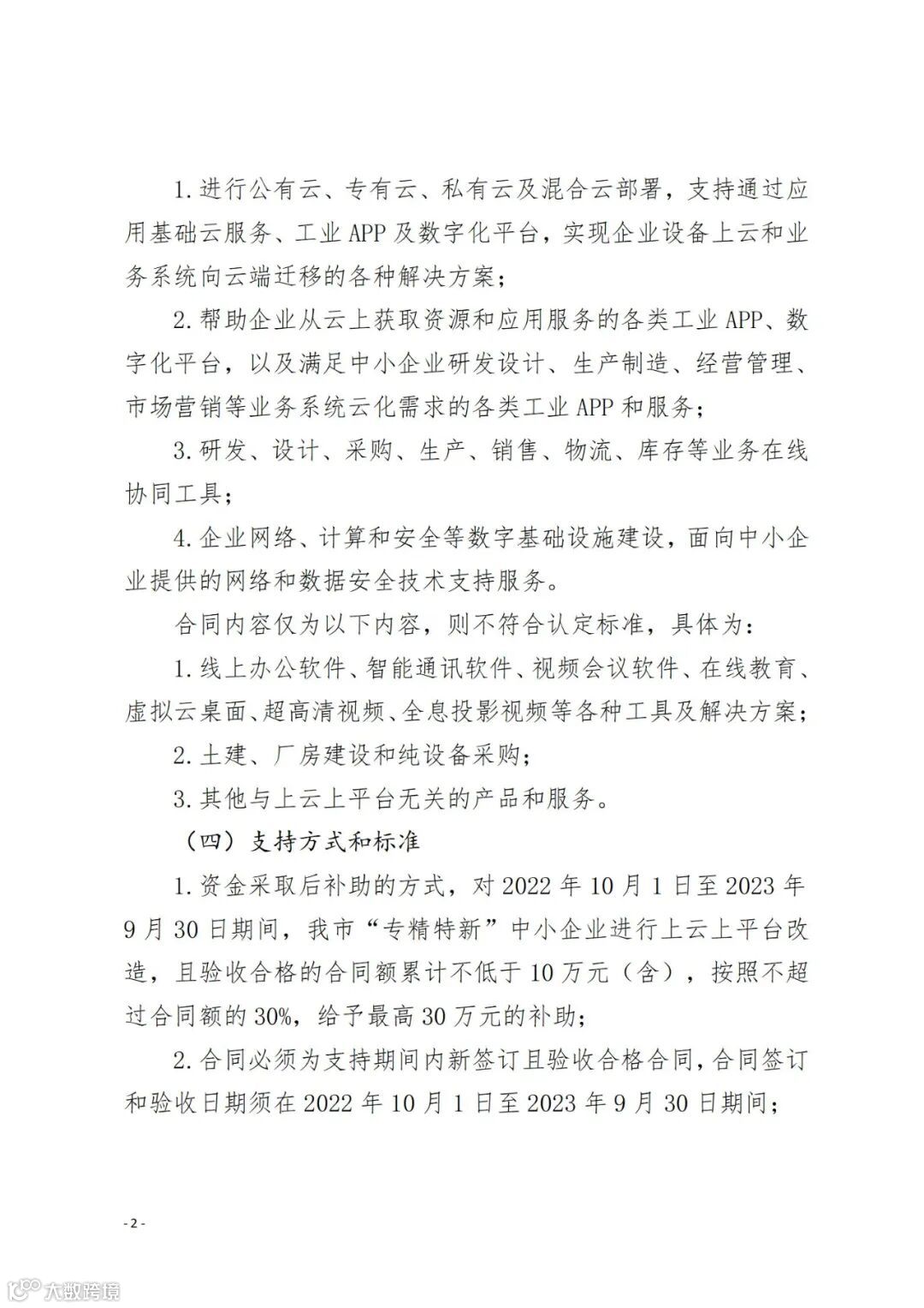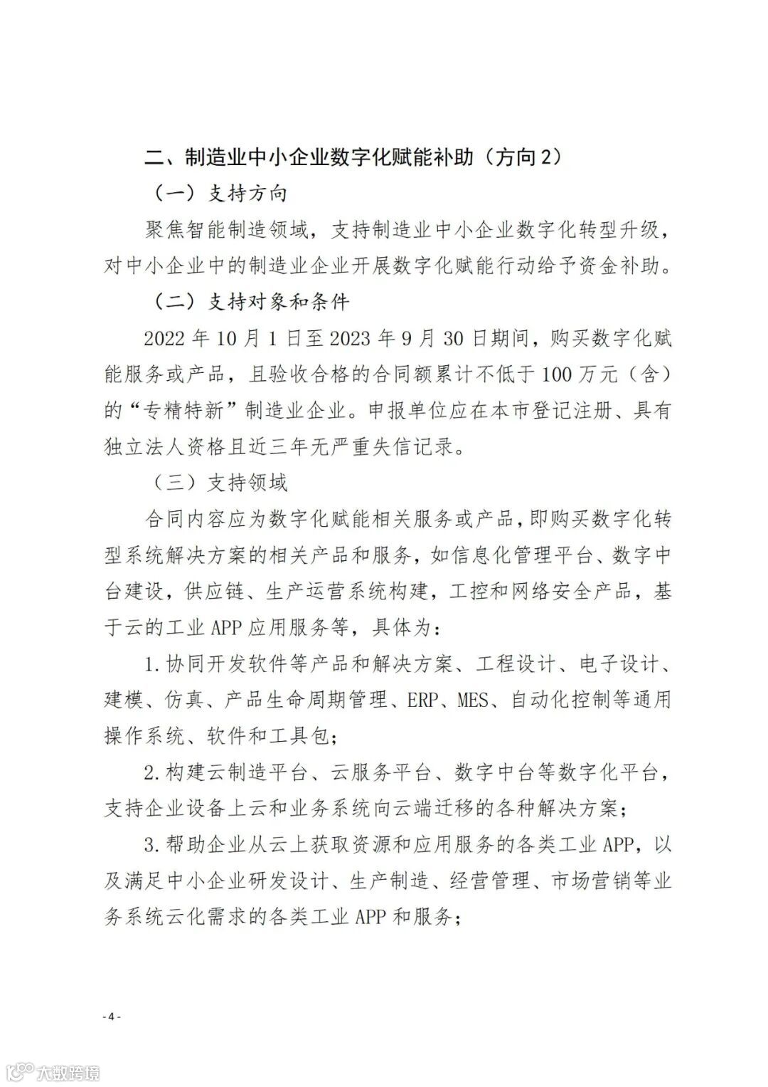 方向8中小企业数字化赋能补助。一是支持“专精特新”中小企业上云上平台,对2022年10月1日至2023年9月30日期间,我市“专精特新”中小企业上云上平台项目,且验收合格的合同额累计超过10万元(含),按照不超过合同额的30%,给予最高30万元的补助。二是支持制造业领域“专精特新”中小企业开展数字化赋能行动,对2022年10月1日至2023年9月30日期间,我市“专精特新”制造业企业购买数字化赋能服务或产品,且验收合格的合同额累计超过100万元(含),按照不超过合同额的20%,给予最高100万元的补助(具体详见附件4)。