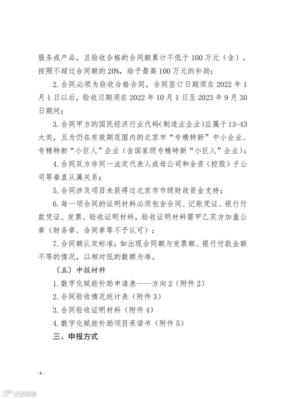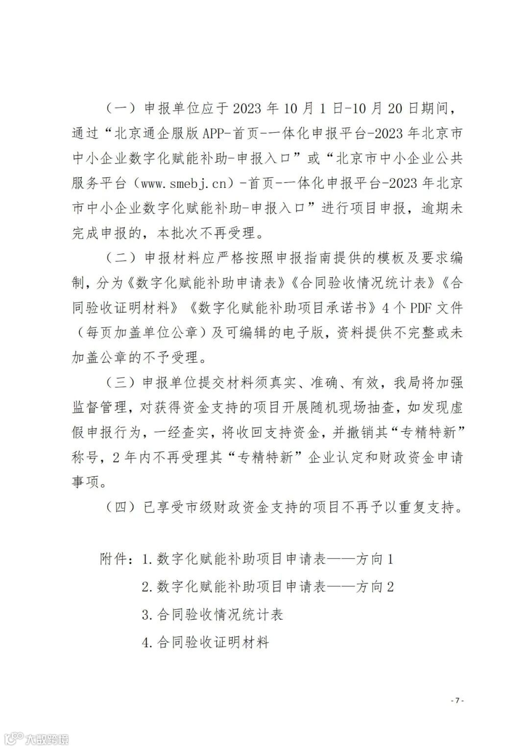 4.方向8申报时间为2023年10月1日至2023年10月20日。符合条件的申报单位,可在申报期内,通过“北京通企服版APP一体化申报平台-《关于申报2023年度北京市中小企业数字化赋能补助项目的通知》-立即申报”或“北京市中小企业公共服务平台www.smebj.cn