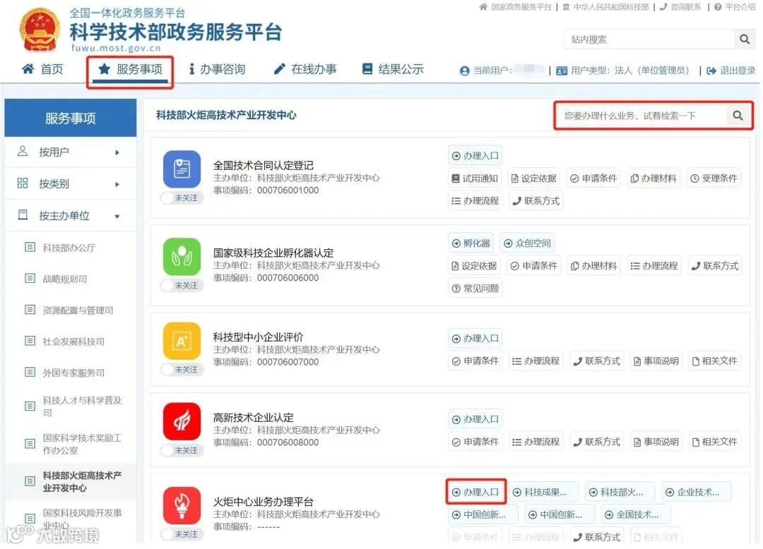(在“服务事项”中查找“火炬中心业务办理平台”模块进入办理,如果右侧清单空白,可以尝试在右上角红框处搜索或更换其他浏览器)