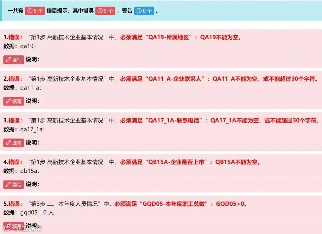 按照系统逻辑进行数据填报,如数据填写不符合系统逻辑,会出现错误和警告提示。针对警告项,需确认数据,若无误则需针对警告数据逐项填写情况说明(精简且真实有效)。针对错误项,必须进行数据修正或填写说明。