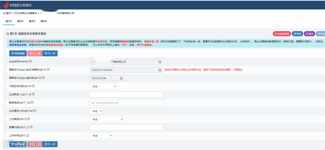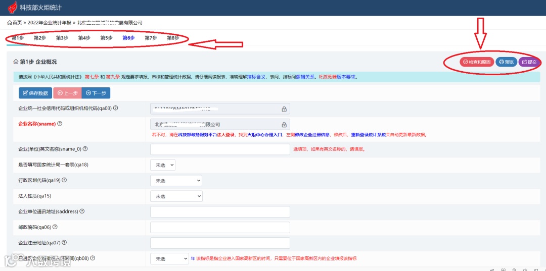 不同于高新年报,火炬统计年报共8步内容,依次填报完第1至第8步(下方有“保存数据”按钮,数据可暂存),点击“提交”,年报填写完成。