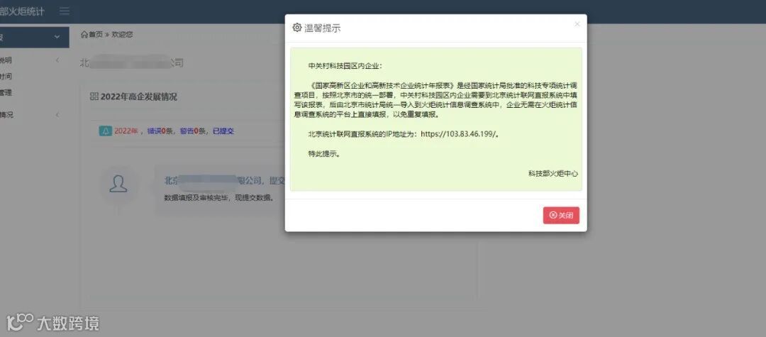 (此时园区内(中关村科技园)且已列入北京统计联网直报系统的高新技术企业,会出现上述提示,提示企业不需要单独填报火炬统计年报)
