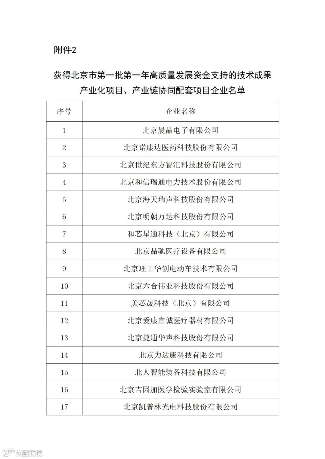 2.获得北京市第一批第一年高质量发展资金支持的技术成果产业化项目、产业链协同配套项目企业名单