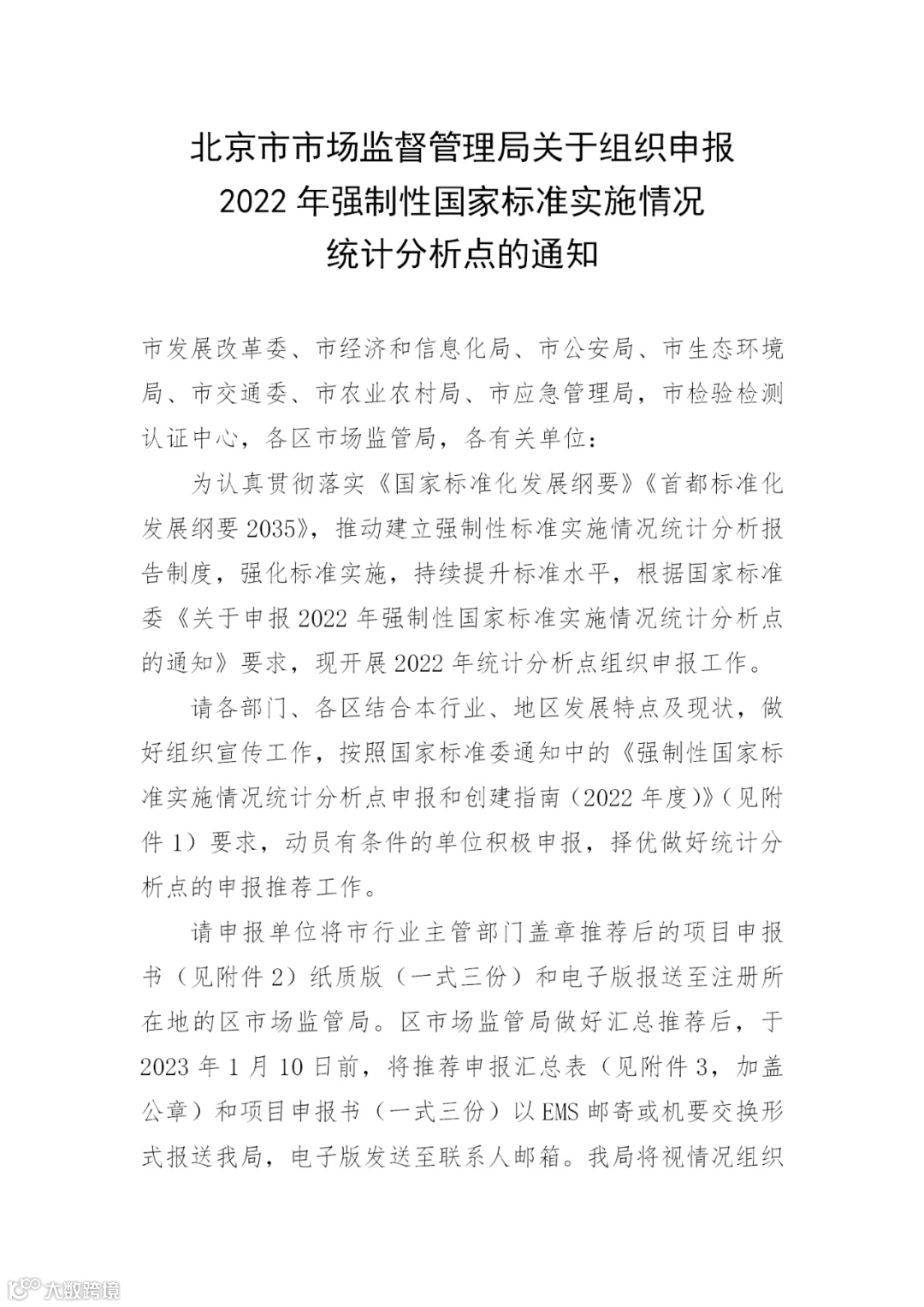 附件1:北京市市场监督管理局关于组织申报2022年强制性国家标准实施情况统计分析点的通知.docx