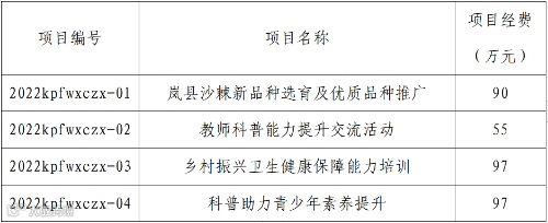 为深入贯彻落实中国科协乡村振兴工作领导小组2022年第一次全体会议精神,推动中国科协定点帮扶工作,中国科协科普部面向山西省吕梁市临县、岚县组织实施2022年度科普服务乡村振兴行动第一批申报评审项目,通过申报评审方式遴选确定承担单位。现将项目申报有关事项通知如下: