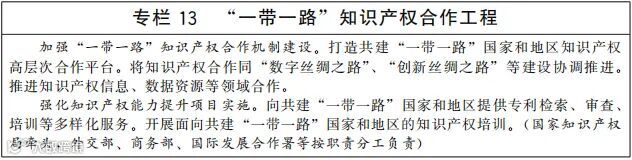 加强知识产权国际合作机制建设。巩固和完善“一带一路”知识产权合作,充分利用“一带一路”知识产权合作平台,扩大合作项目规模和储备。深度参与金砖国家、中美欧日韩、中日韩、中国—东盟等小多边知识产权合作,加强与各方政策和业务规则交流,支持产业界积极参与相关合作机制。完善跨境司法协作安排,加强防范打击侵犯知识产权犯罪国际合作。(中央宣传部、最高人民法院、最高人民检察院、外交部、公安部、商务部、海关总署、国家知识产权局等按职责分工负责)