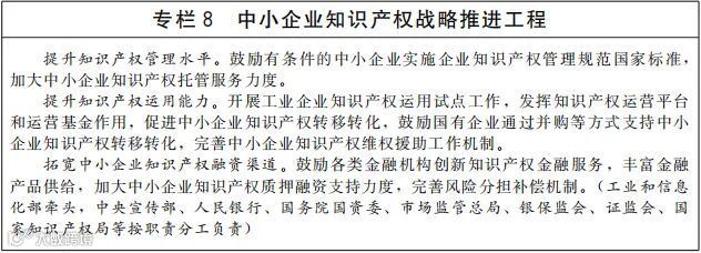 提升创新主体知识产权管理效能。推动创新主体加强知识产权管理标准化体系建设,推动实施创新过程知识产权管理国际标准。推动中央企业建立完善知识产权工作体系,打造一批具备国际竞争优势的知识产权强企。深化实施中小企业知识产权战略推进工程。分级分类开展企业、高校、科研院所知识产权优势培育和建设工作。引导创新主体建立健全知识产权资产管理制度,推动企业做好知识产权会计信息披露工作。建立健全财政资助科研项目形成知识产权的声明制度和监管机制。(教育部、科技部、工业和信息化部、财政部、国务院国资委、税务总局、市场监管总局、中科院、国家知识产权局等按职责分工负责)