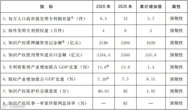 到2025年,知识产权强国建设阶段性目标任务如期完成,知识产权领域治理能力和治理水平显著提高,知识产权事业实现高质量发展,有效支撑创新驱动发展和高标准市场体系建设,有力促进经济社会高质量发展。