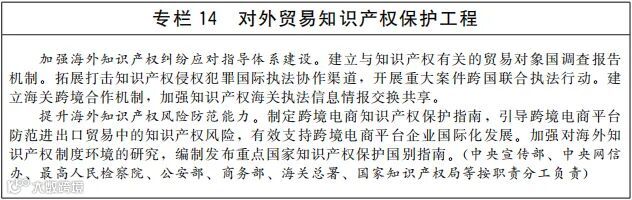 完善维护国家安全的知识产权政策。研究制定事关国家安全的关键核心技术知识产权保护规则。依法管理涉及国家安全的知识产权对外转让行为,完善知识产权对外转让审查制度。完善知识产权反垄断、公平竞争相关法律法规和政策措施。推进我国知识产权有关法律规定域外适用。研究建立针对进口贸易的知识产权境内保护制度。完善跨境电商知识产权保护规则。(中央宣传部、中央网信办、国家发展改革委、科技部、工业和信息化部、商务部、市场监管总局、国家国防科工局、国家知识产权局等按职责分工负责)