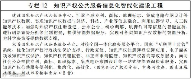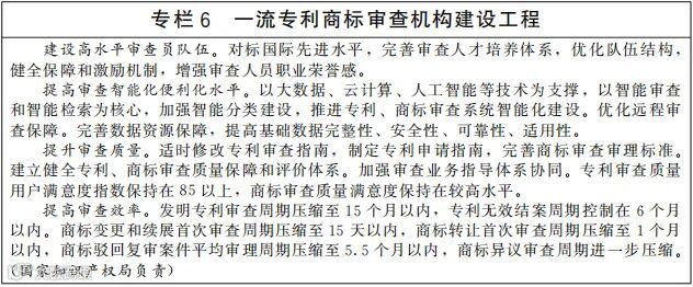 提高知识产权审查质量和审查效率。完善适应创新发展需求的知识产权审查管理体系,优化专利、商标审查协作机制。提升专利商标审查机构能力水平,强化专利、商标、版权、地理标志、植物新品种全流程审查质量管控,提升知识产权授权确权质量。提高专利、商标审查业务精细化管理水平,优化审查资源配置,加强智能化技术运用,提升审查效能,缩短审查周期。完善专利、商标审查模式,加强审查与产业发展的政策协同和业务联动,满足产业绿色转型和新领域新业态创新发展等社会多样化需求。(中央宣传部、工业和信息化部、农业农村部、国家林草局、国家知识产权局等按职责分工负责)