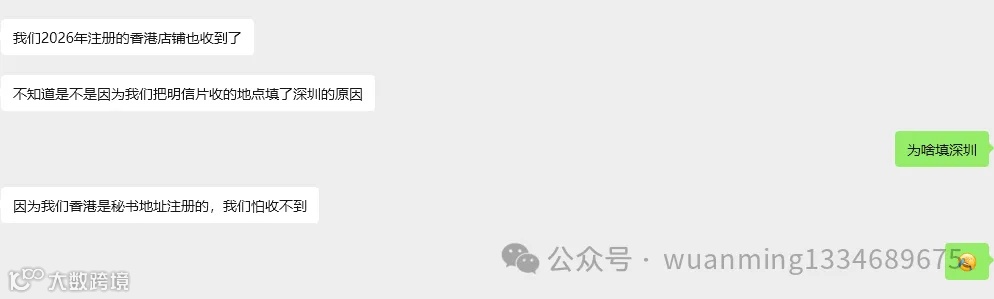 实例表明:2020年注册的香港店铺、2021年注册的美国店铺及2026年新设且明信片地址填深圳的香港主体,均收到系统误送通知。