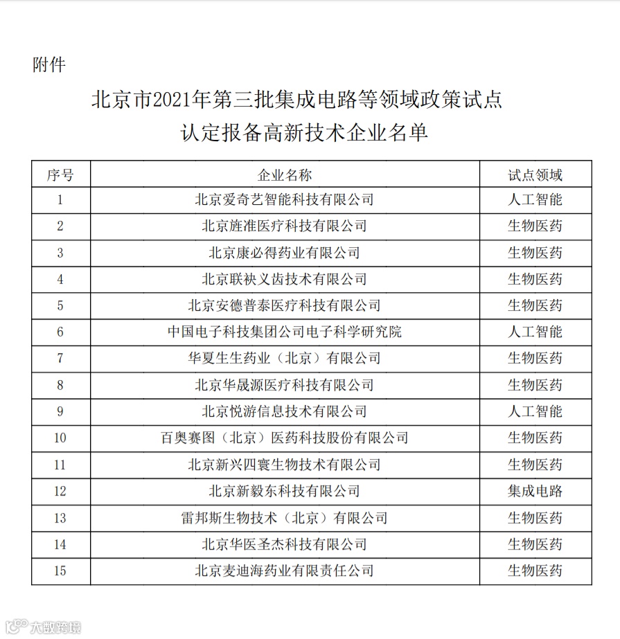 按照国务院《关于深化北京市新一轮服务业扩大开放综合试点建设国家服务业扩大开放综合示范区工作方案的批复》(国函〔2020〕123号)精神,根据《高新技术企业认定管理办法》(国科发火〔2016〕32号)和《高新技术企业认定管理工作指引》(国科发火〔2016〕195号)有关规定,现将北京市2021年第三批集成电路等领域政策试点认定报备的15家高新技术企业名单(详见附件)予以公示,公示期为10个工作日。