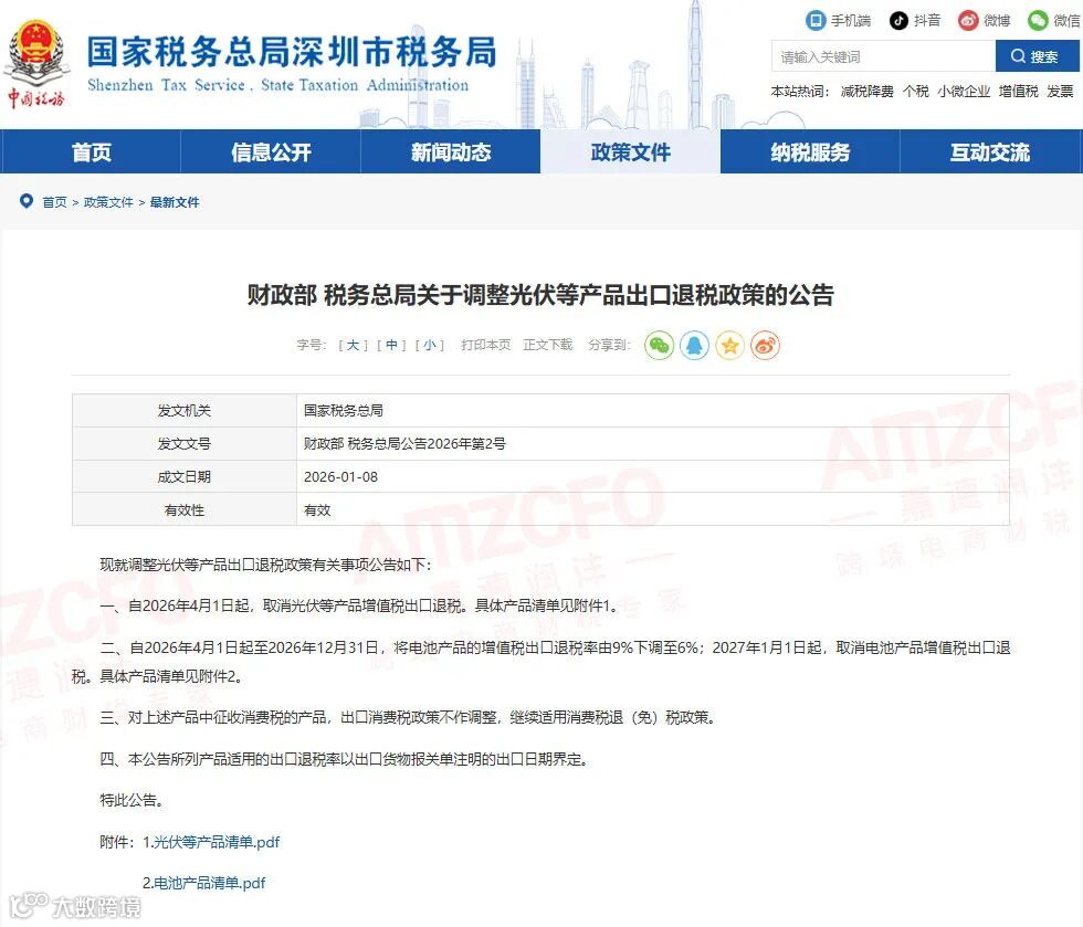 财政部、税务总局公告2026年第2号明确:2026年4月1日起,取消光伏等249项产品出口退税。企业需根据商品HS编码在电子税务局查询特殊标识: