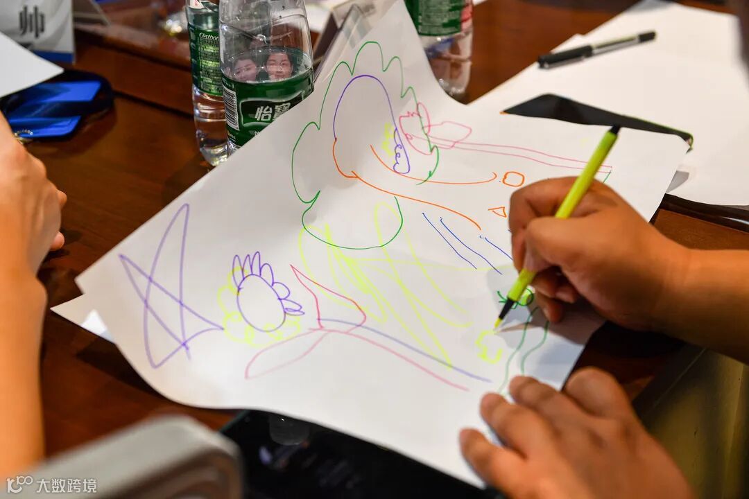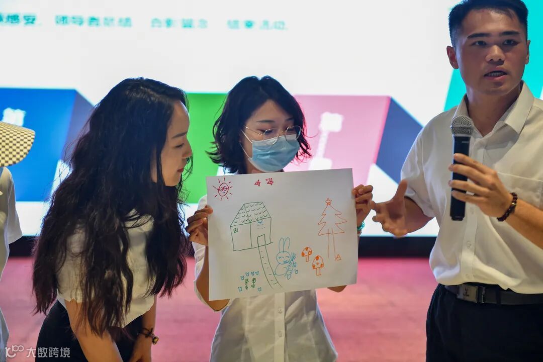 第四个环节中,每组在纸上接龙绘画,不限定主题,小组成员可尽情将内心想法展现在画纸上,画完后小组讨论确定作品主题并上台分享。