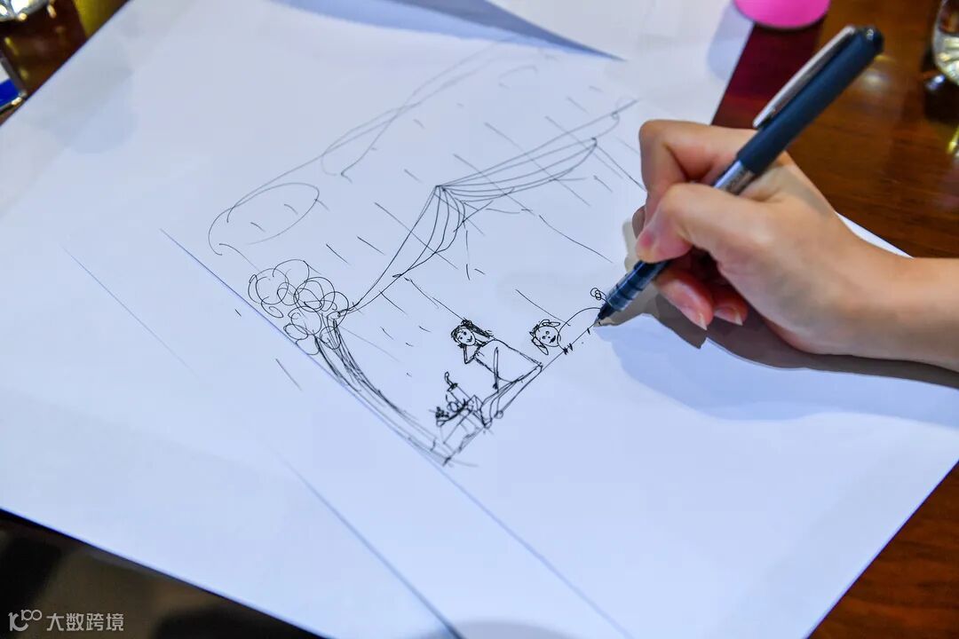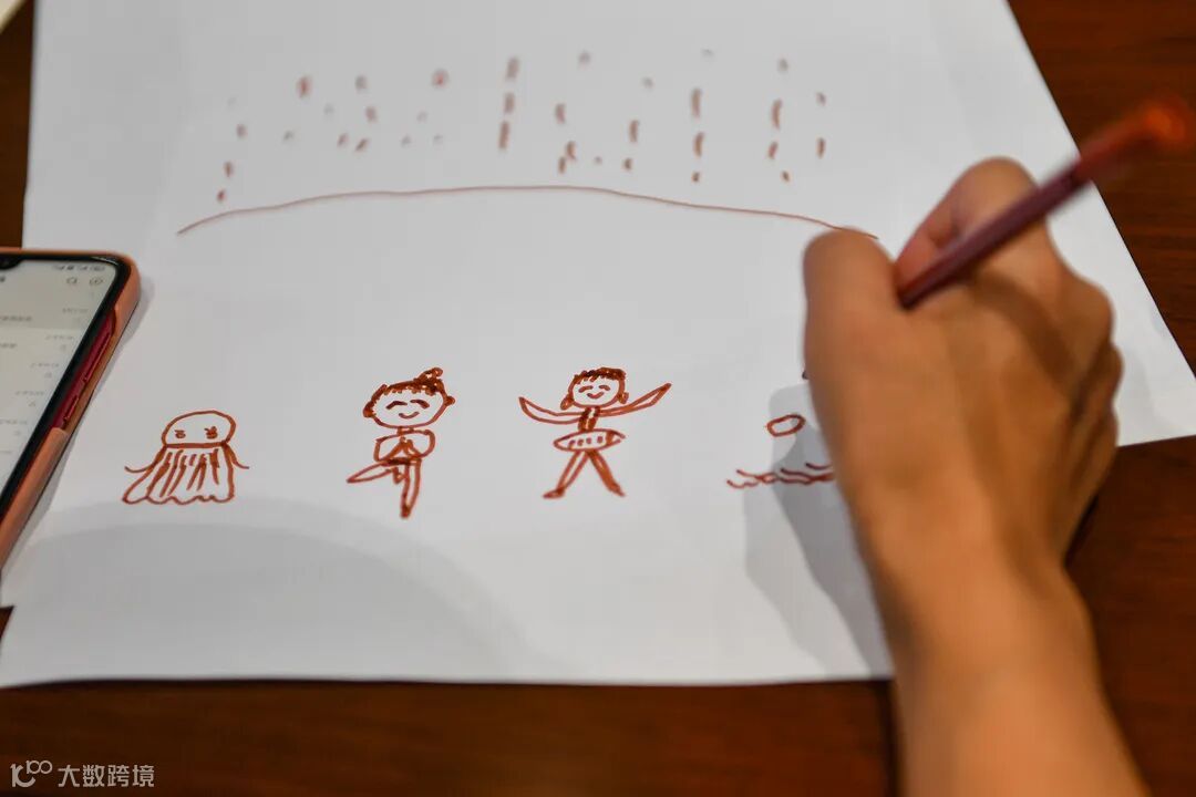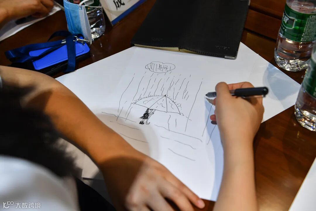 “如果要你在脑海中想象一幅雨中人的画面,它是什么样子的?拿起你面前的笔把它在纸上画出来。”