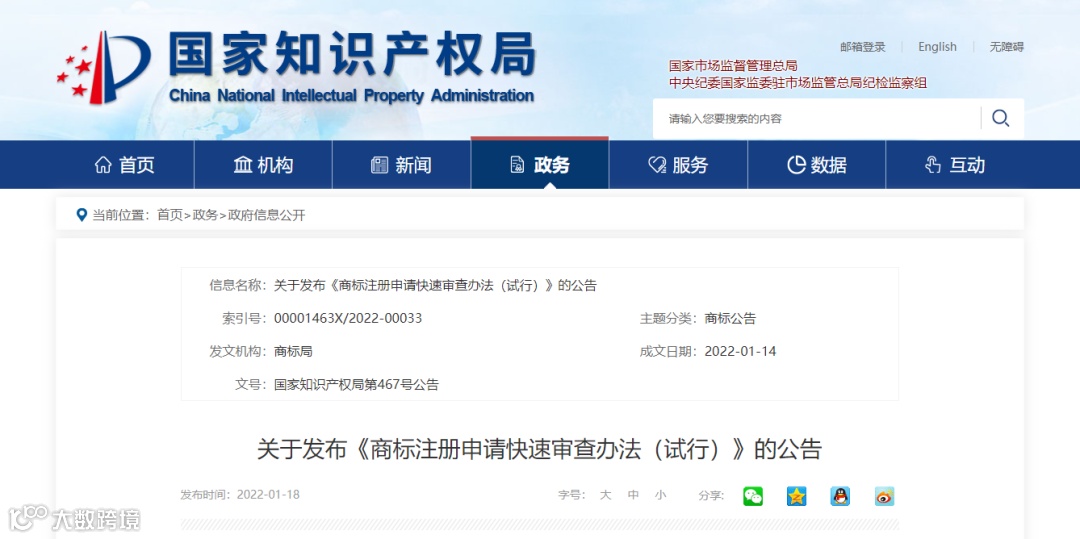 为认真贯彻落实党中央、国务院关于加强知识产权保护的决策部署,落实知识产权领域“放管服”改革措施,完善商标审查制度,更好满足市场主体差异化需求,服务经济社会高质量发展,国家知识产权局制定《商标注册申请快速审查办法(试行)》,现予以发布,自发布之日起施行。