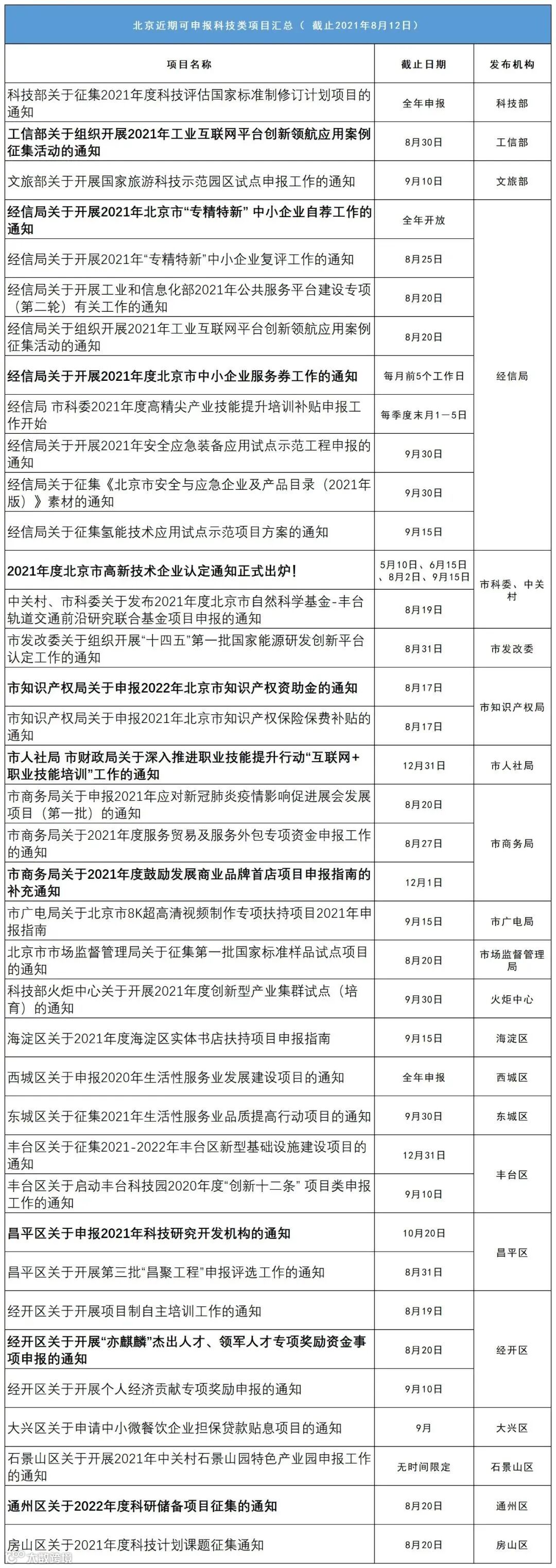 北京 | 一周政策 北京近期可申报科技类项目汇总( 截止2021年8月12日)