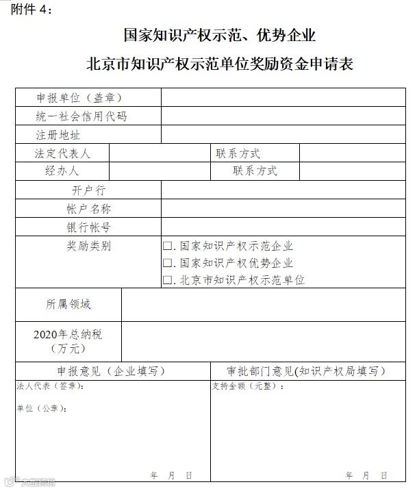 (1)《国家知识产权示范、优势企业、北京市知识产权示范单位奖励资金申请表》(附件4);