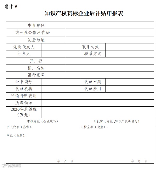 (1)《知识产权贯标企业后补助项目申报表》(附件5);