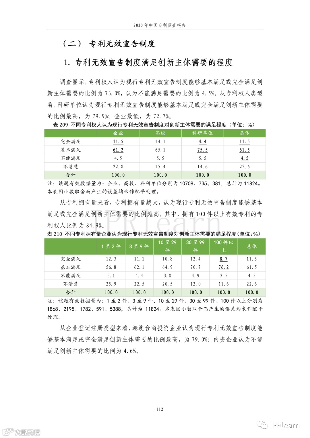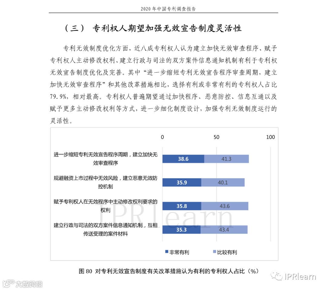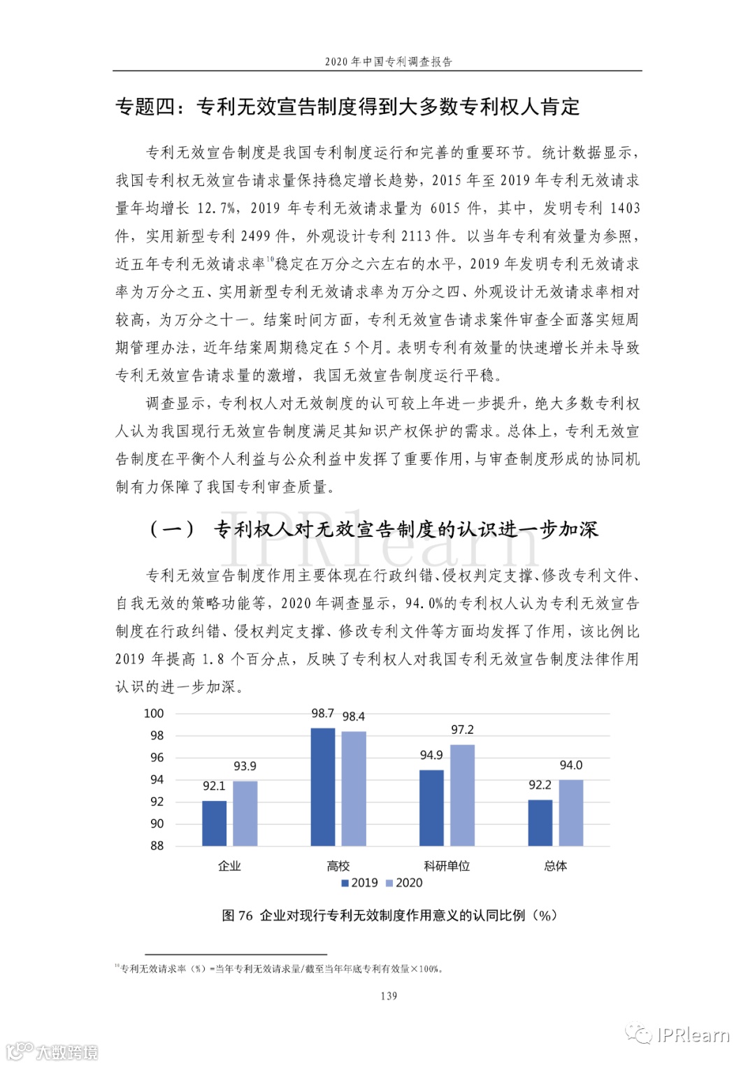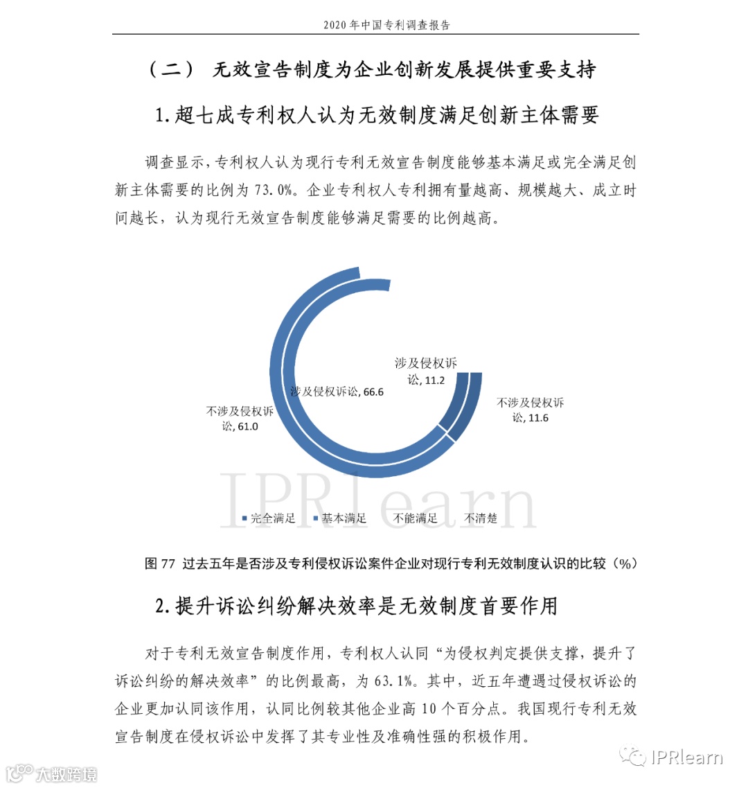 我国现行无效制度满足创新主体需要。73.0%的专利权人认为现行专利无效宣告制度能够满足创新主体需要。94.0%的专利权人认为专利无效宣告制度在行政纠错、侵权判定支撑、修改专利文件等方面发挥了作用,该比例比2019年提高了1.8个百分点。