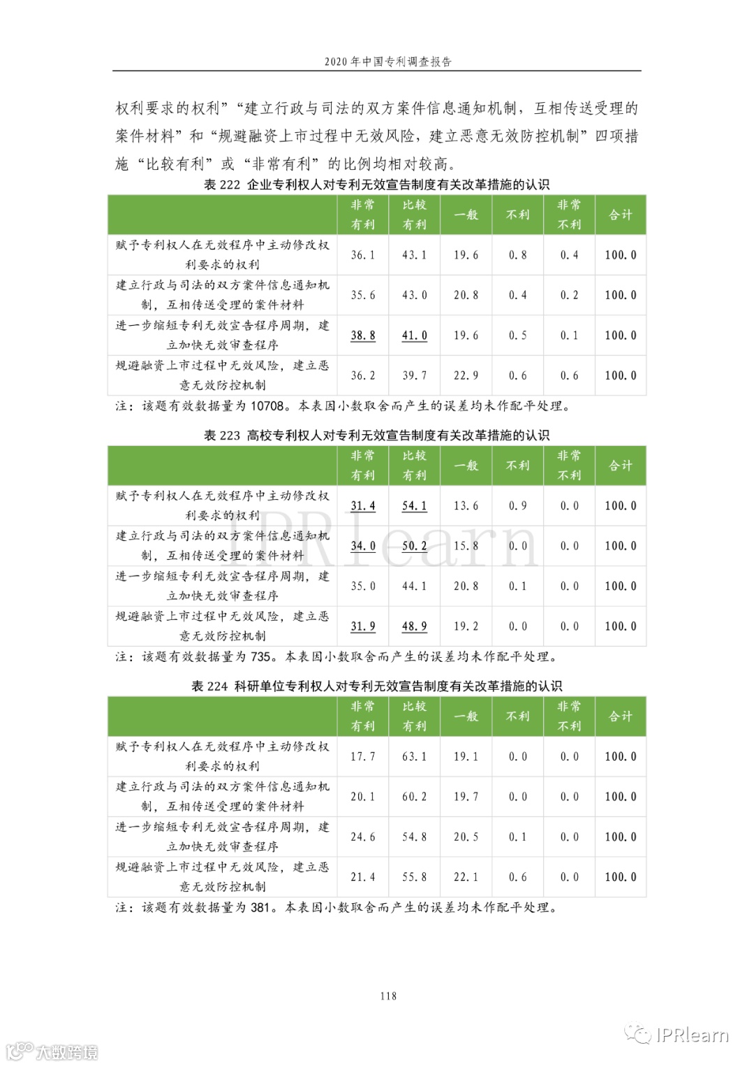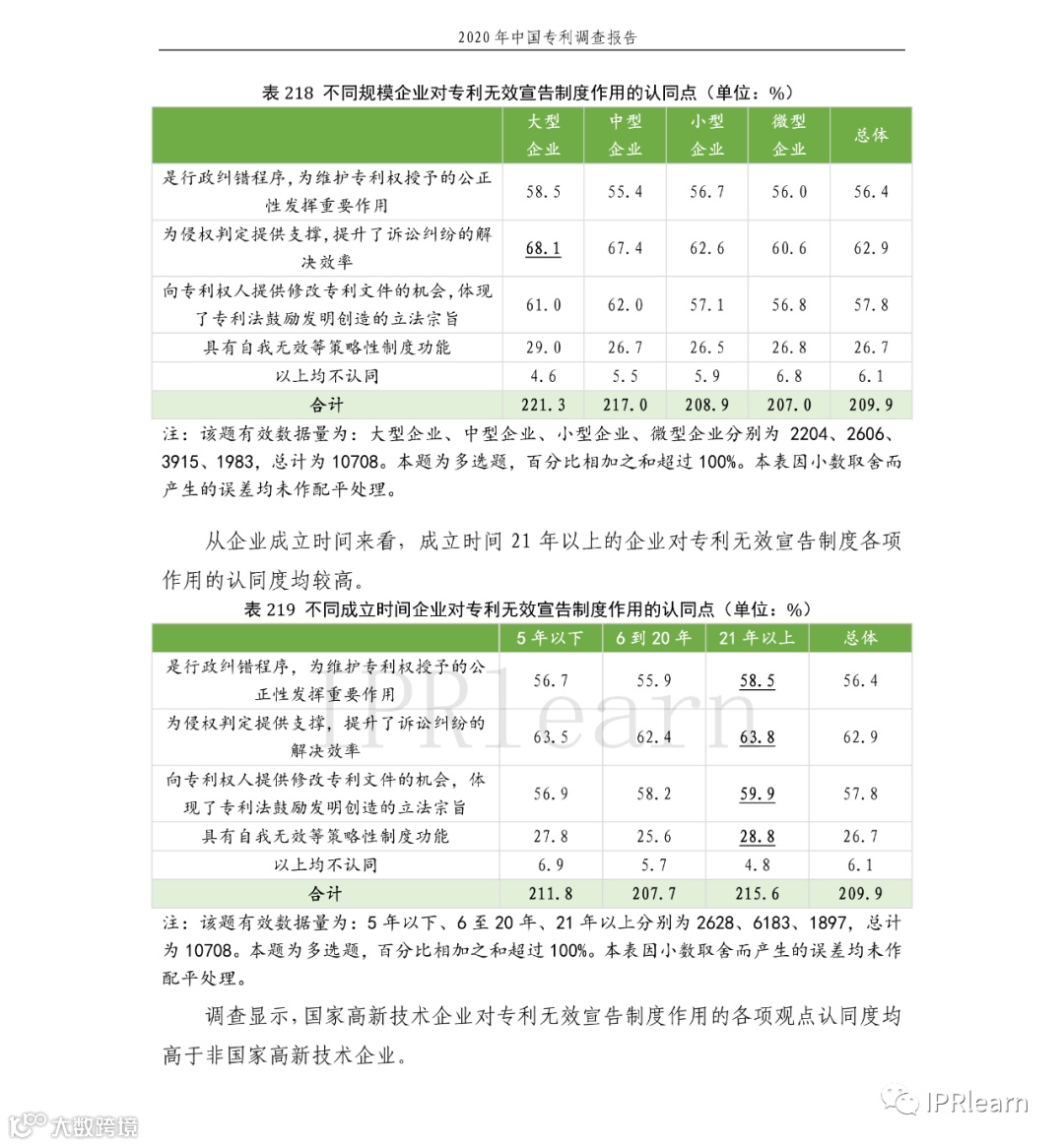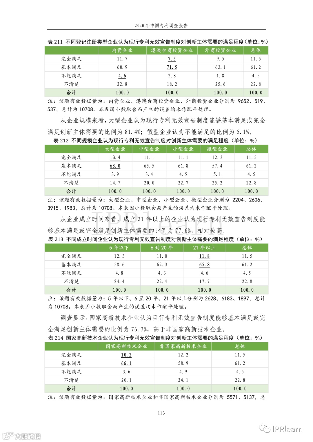 我国现行无效制度满足创新主体需要。73.0%的专利权人认为现行专利无效宣告制度能够满足创新主体需要。94.0%的专利权人认为专利无效宣告制度在行政纠错、侵权判定支撑、修改专利文件等方面发挥了作用,该比例比2019年提高了1.8个百分点。