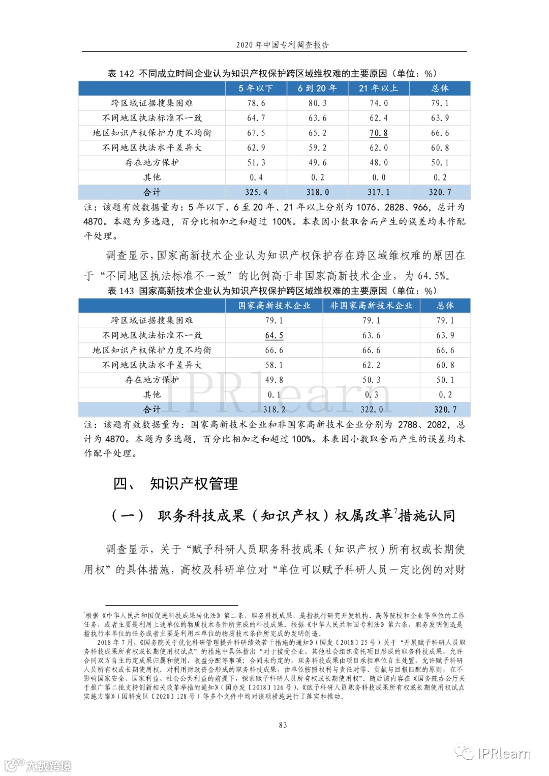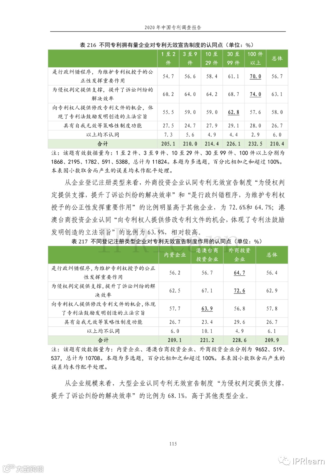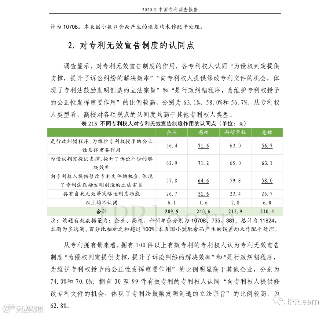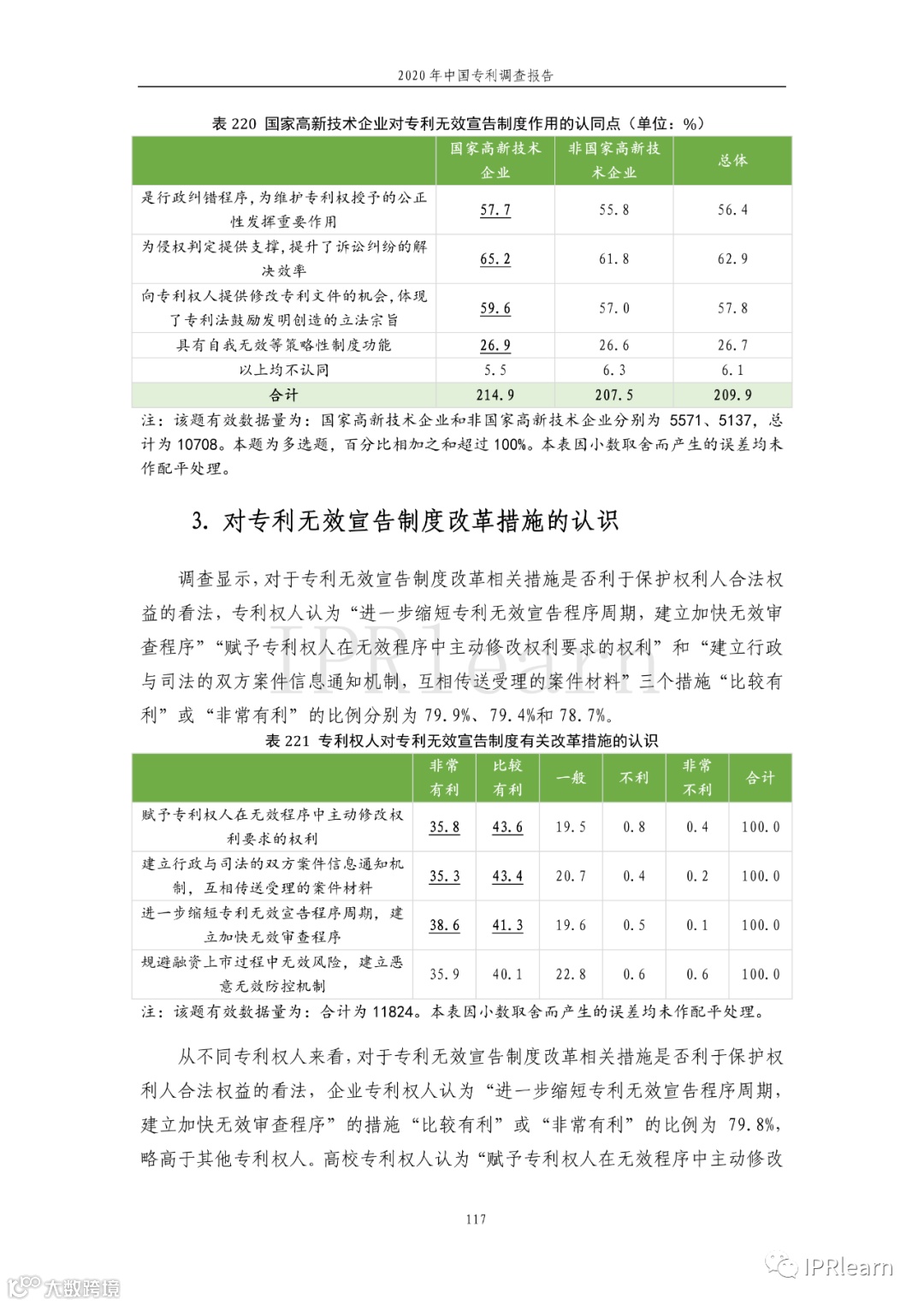 我国现行无效制度满足创新主体需要。73.0%的专利权人认为现行专利无效宣告制度能够满足创新主体需要。94.0%的专利权人认为专利无效宣告制度在行政纠错、侵权判定支撑、修改专利文件等方面发挥了作用,该比例比2019年提高了1.8个百分点。