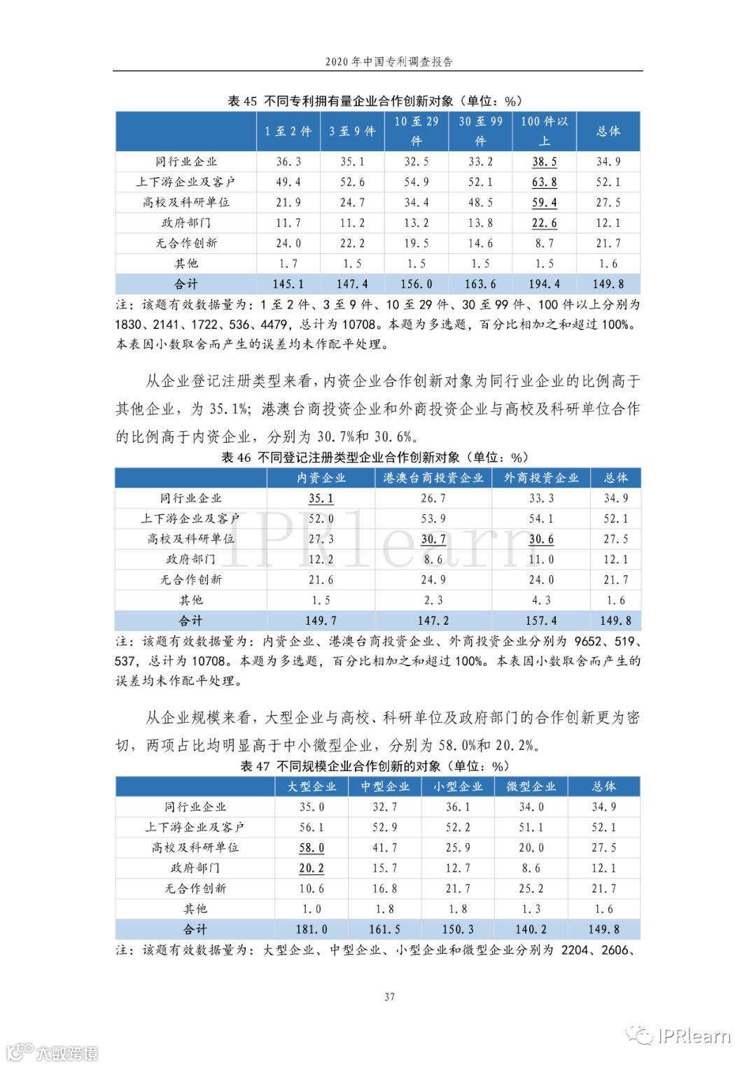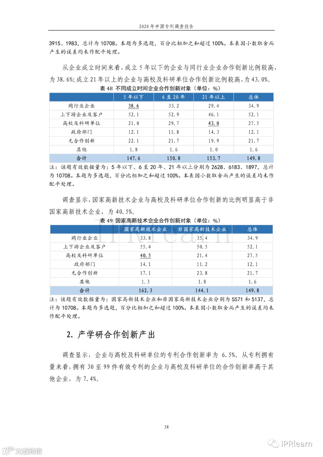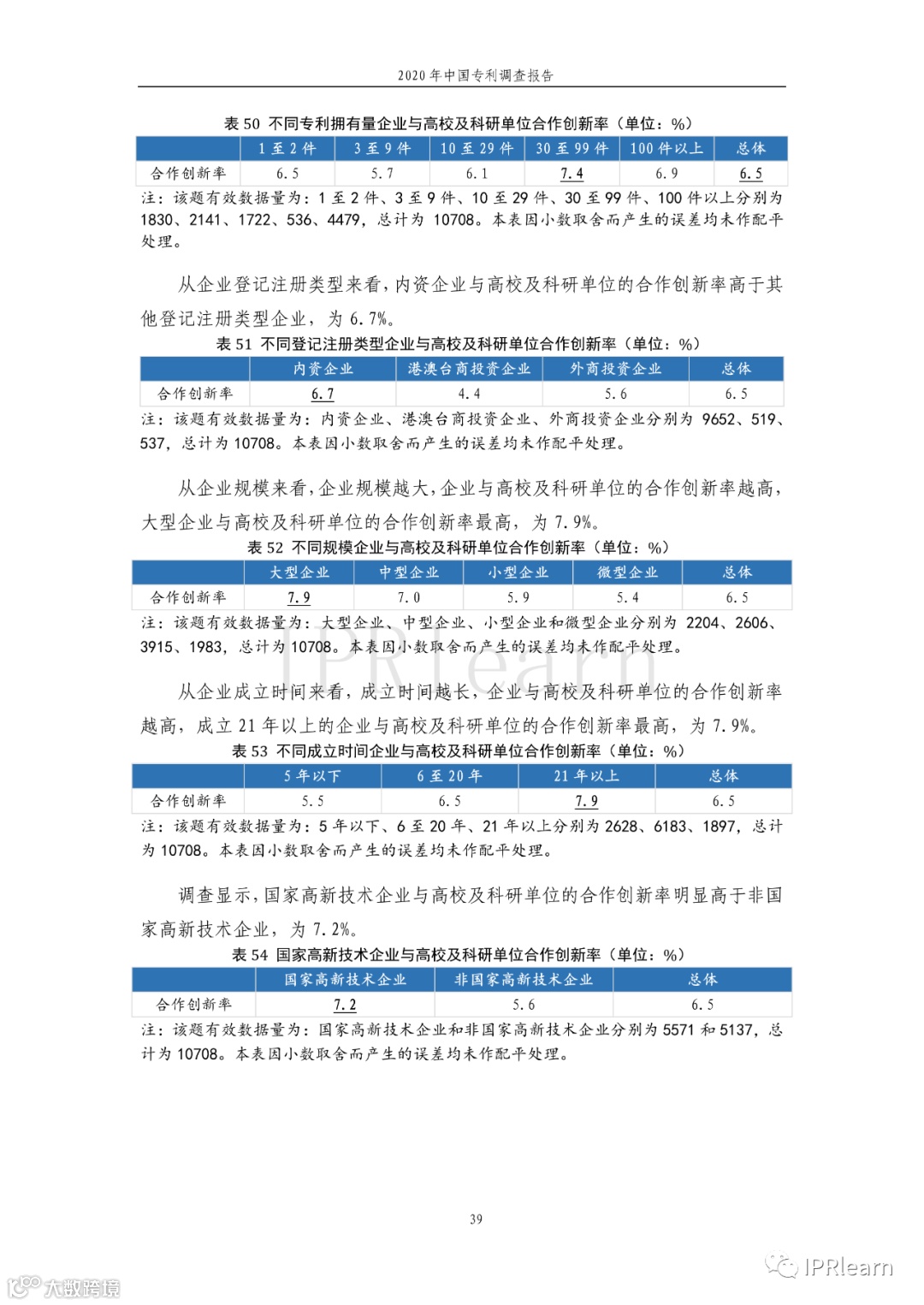 合作创新成为企业重要的创新方式。我国近8成企业专利权人开展过合作创新。52.1%的企业专利权人与上下游企业及客户开展过合作创新,34.9%与同行业企业开展过合作创新,27.5%与高校或科研单位开展过产学研合作创新。其中,国家高新技术企业开展产学研合作创新的比例为40.5%,是非高新技术企业的1.9倍。