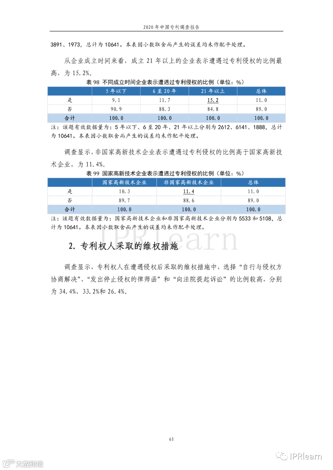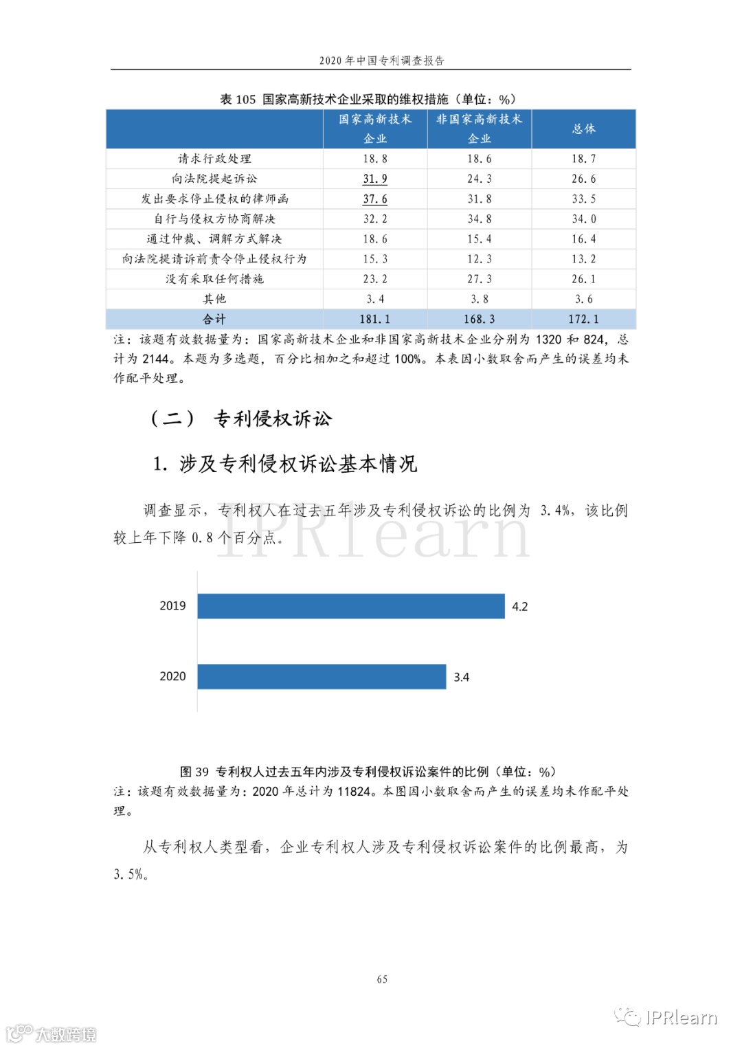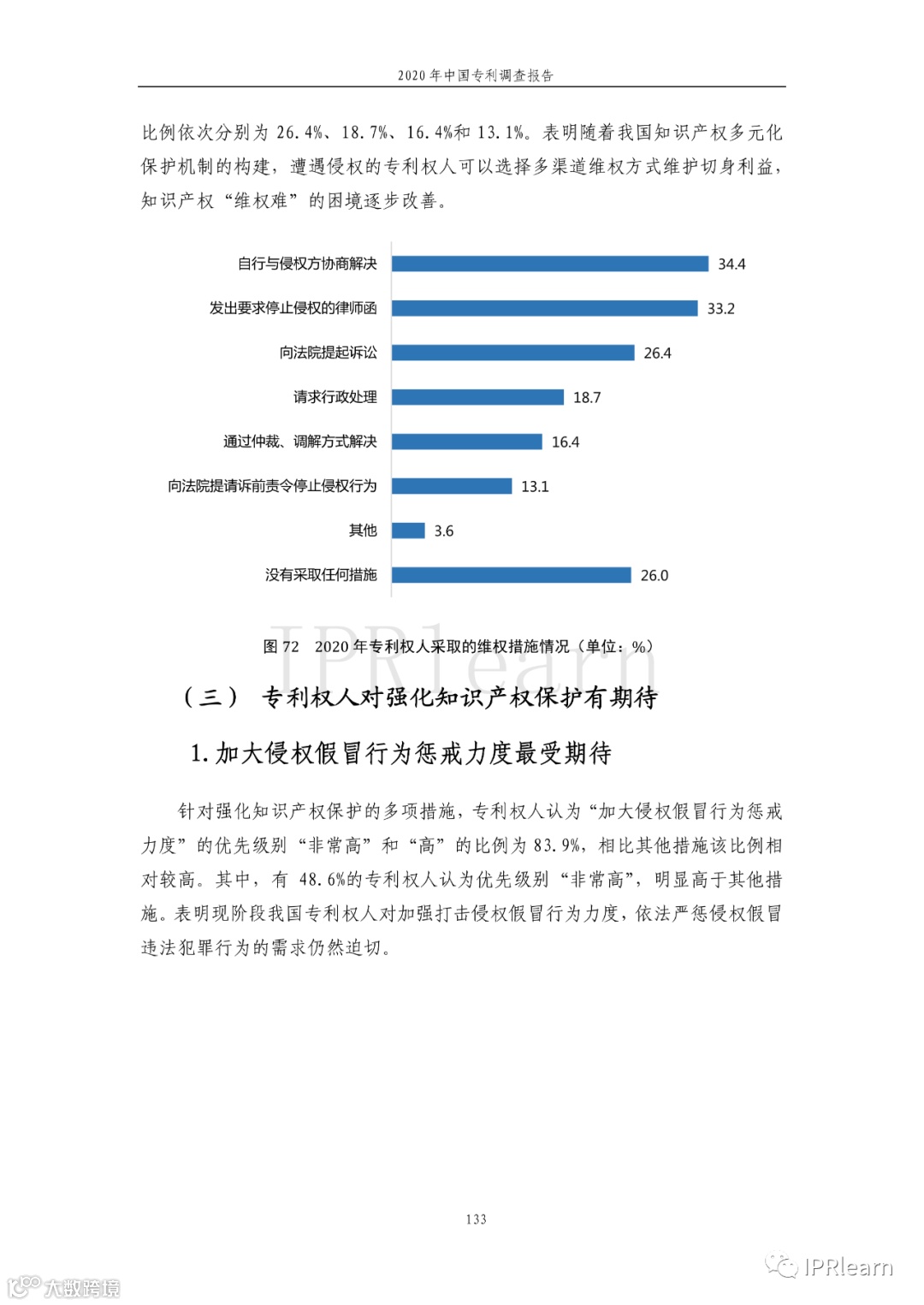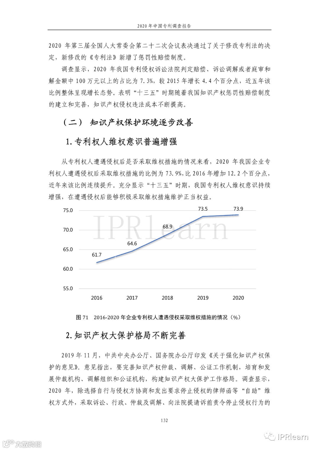 专利权人维权意识持续增强。2020年调查显示,我国企业专利权人遭遇侵权后采取维权措施的比例为73.9%,较2015年提高11.1个百分点,表明专利权人在遭遇侵权后更加积极主动维护自身合法权益。