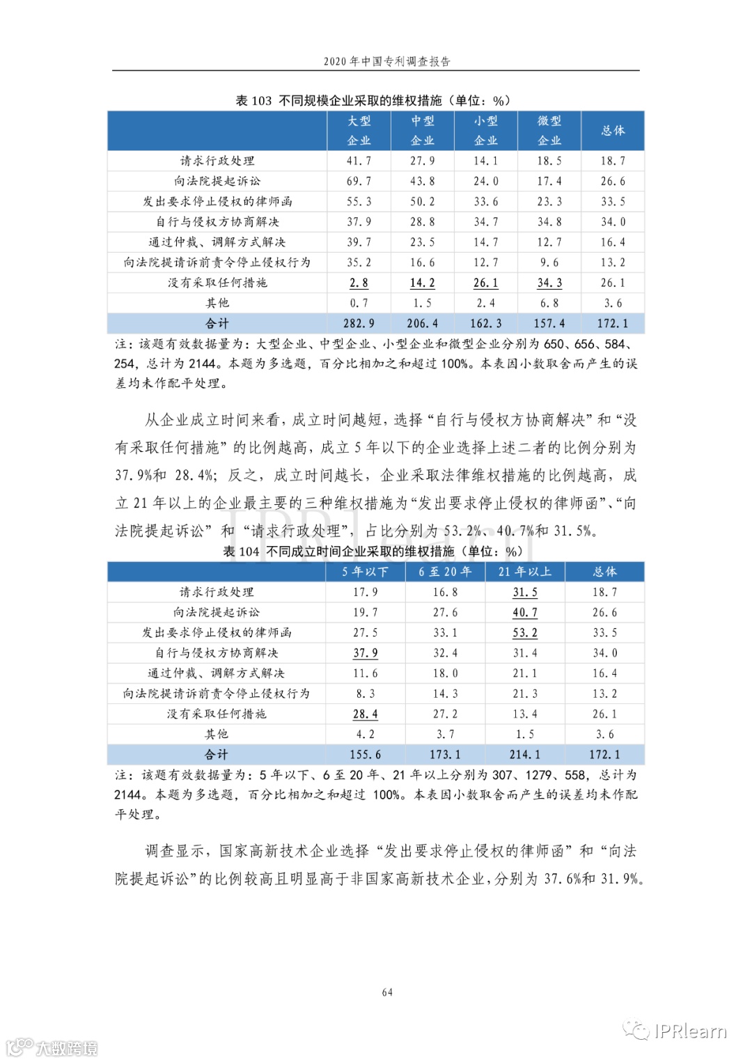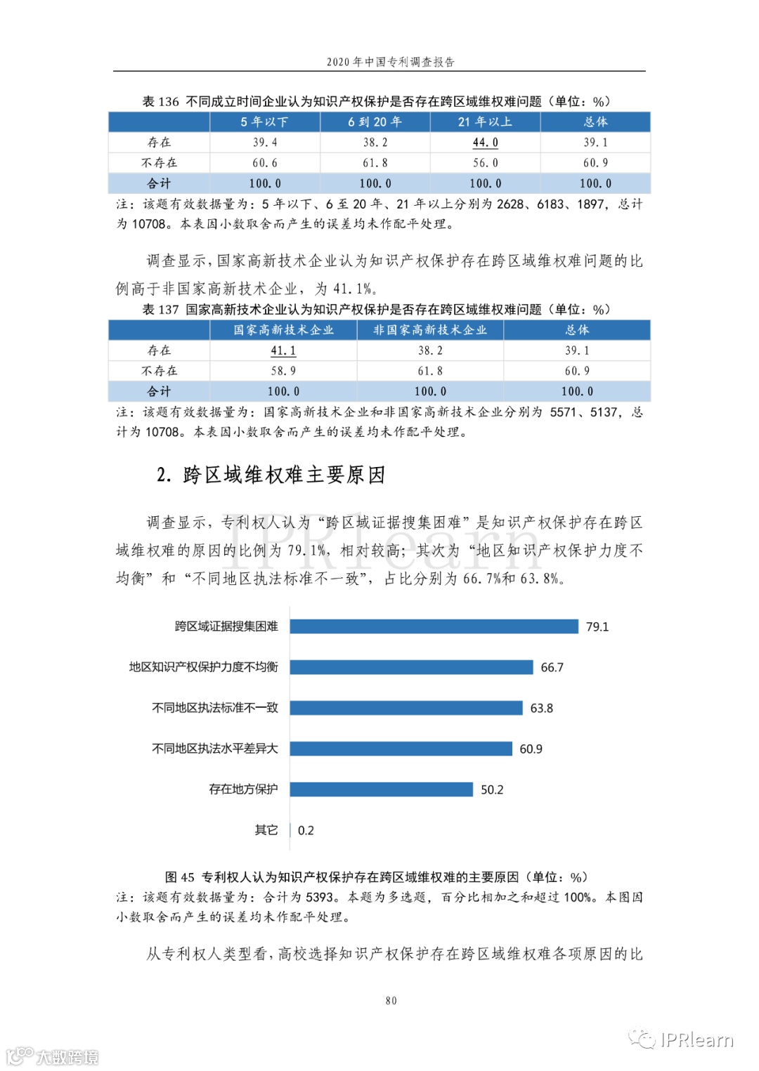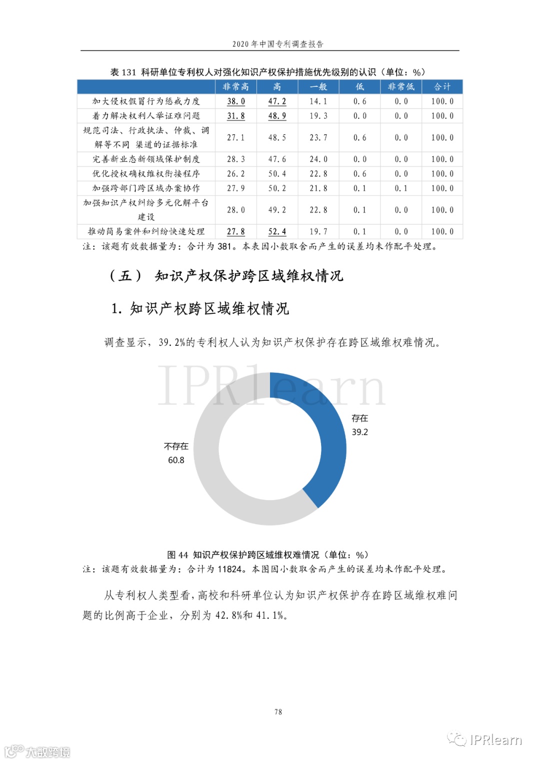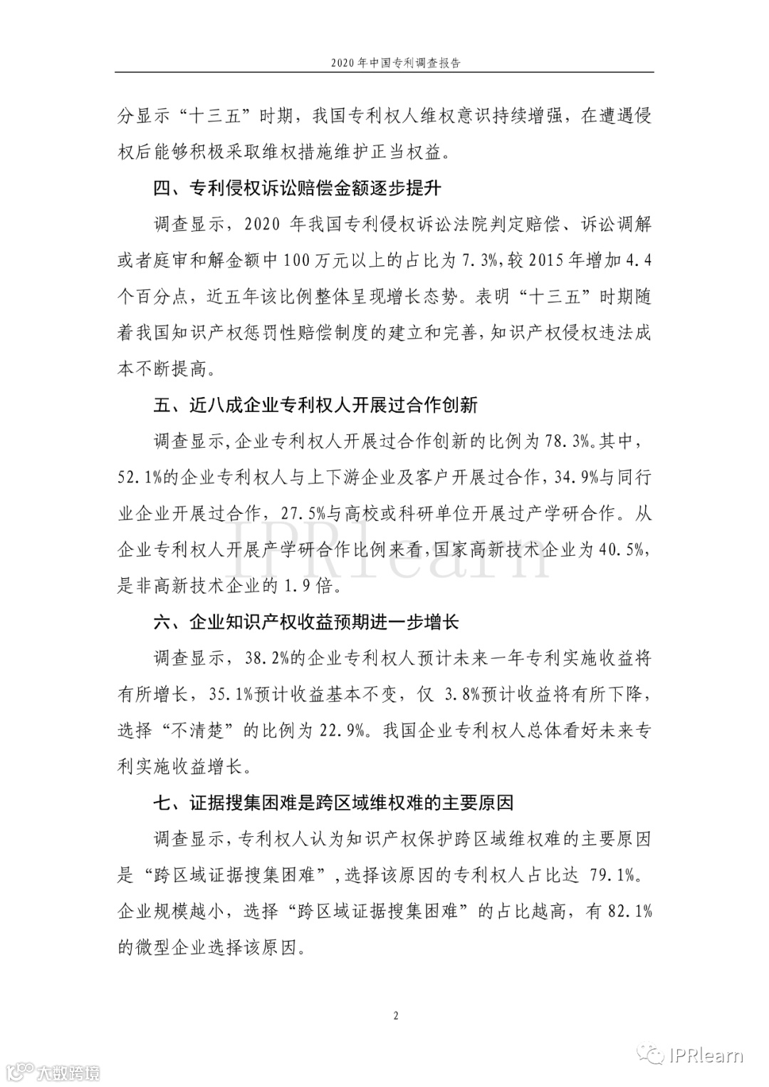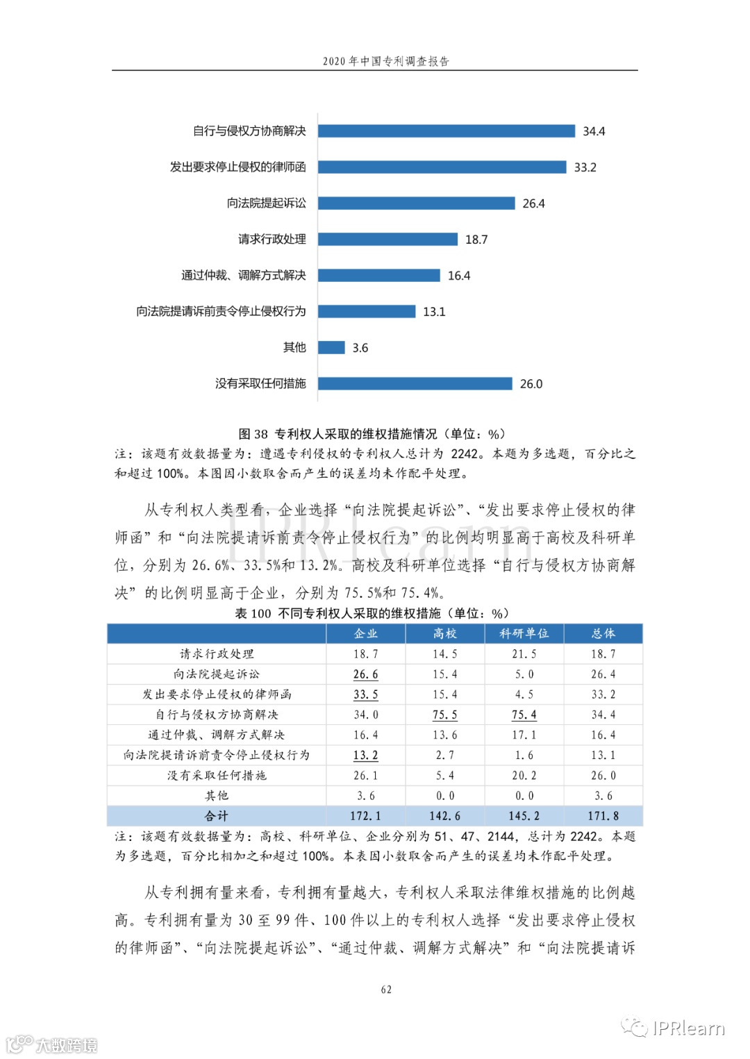 专利权人维权意识持续增强。2020年调查显示,我国企业专利权人遭遇侵权后采取维权措施的比例为73.9%,较2015年提高11.1个百分点,表明专利权人在遭遇侵权后更加积极主动维护自身合法权益。