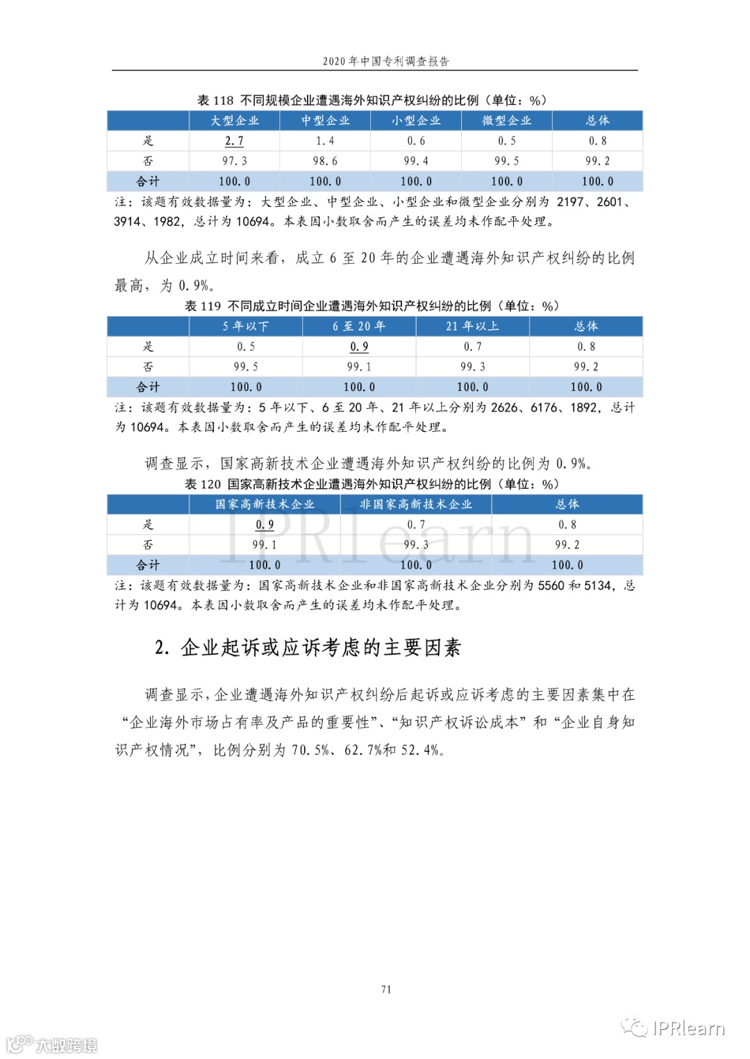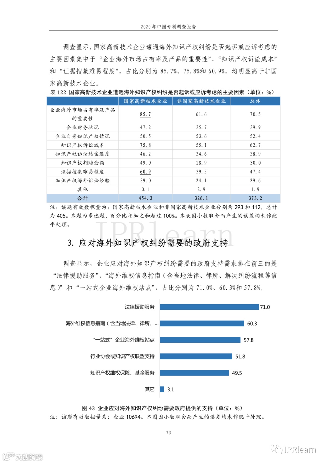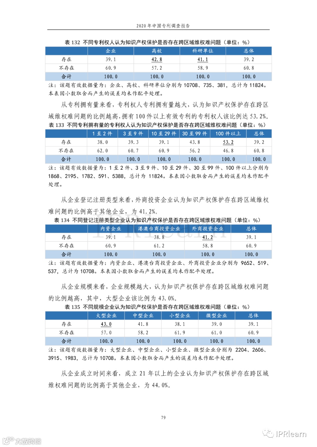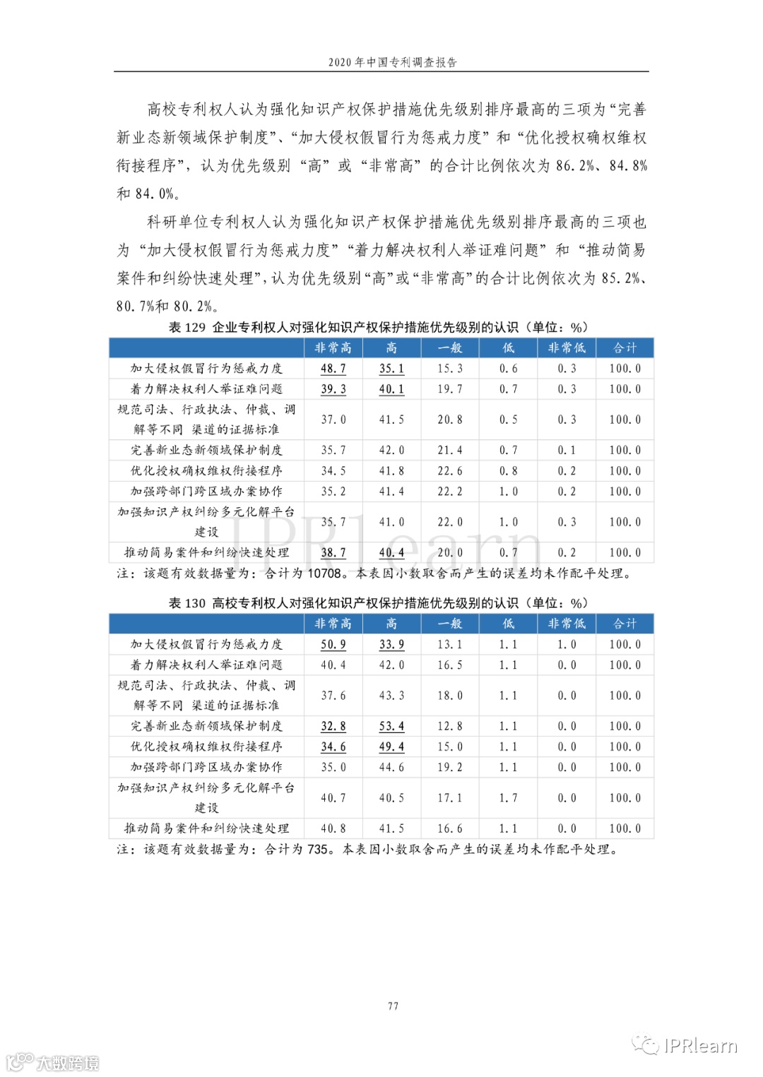 专利权人维权意识持续增强。2020年调查显示,我国企业专利权人遭遇侵权后采取维权措施的比例为73.9%,较2015年提高11.1个百分点,表明专利权人在遭遇侵权后更加积极主动维护自身合法权益。