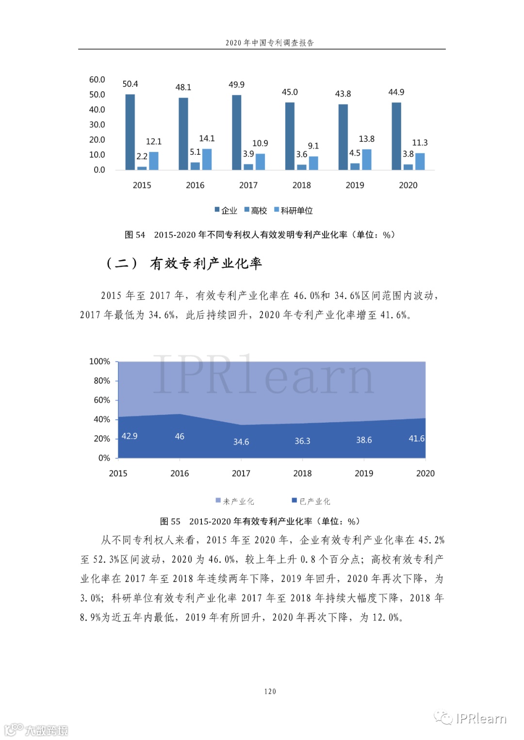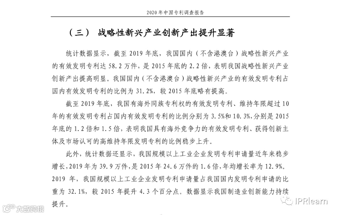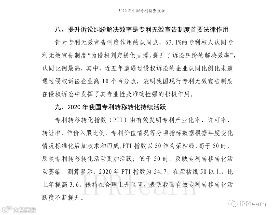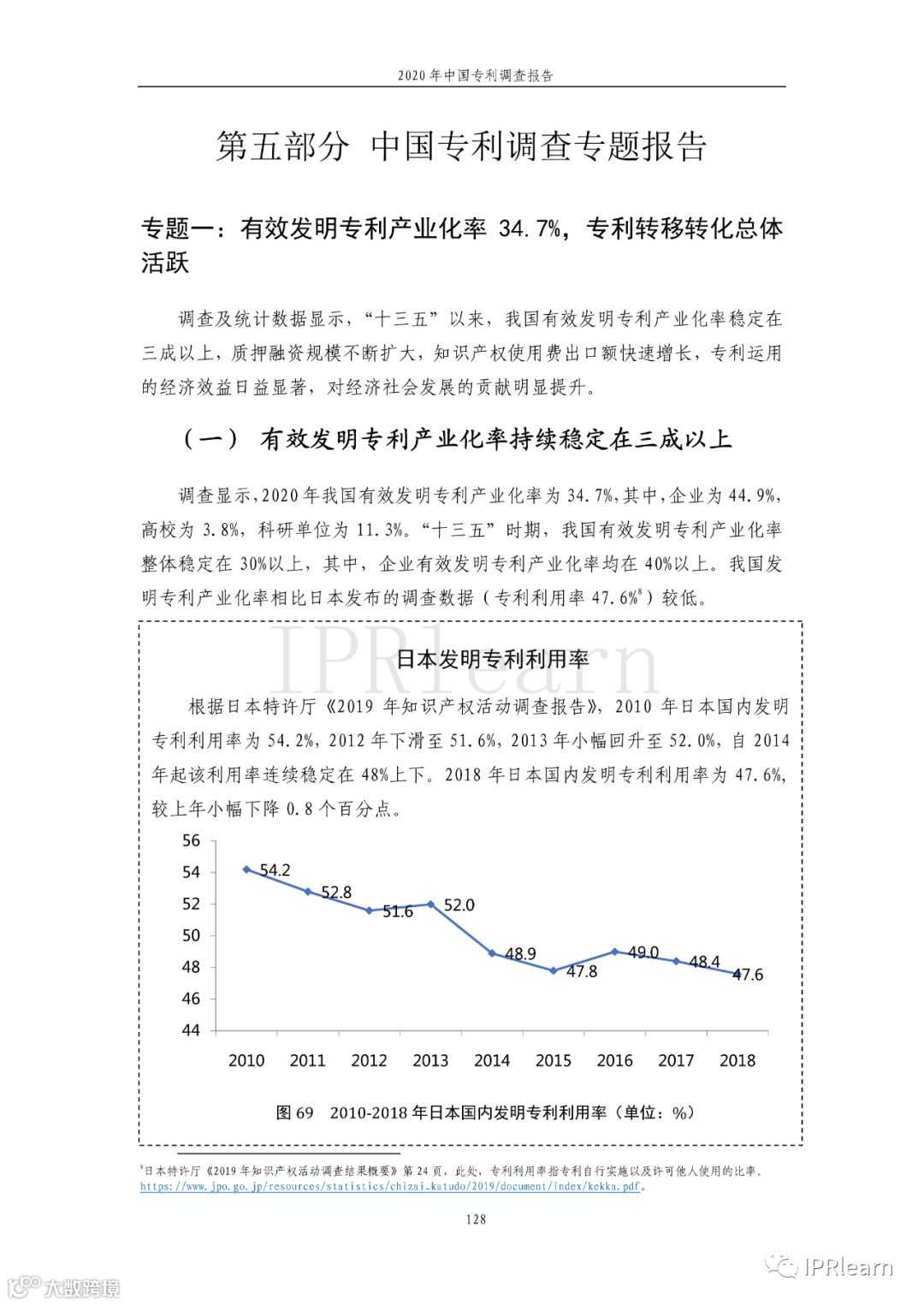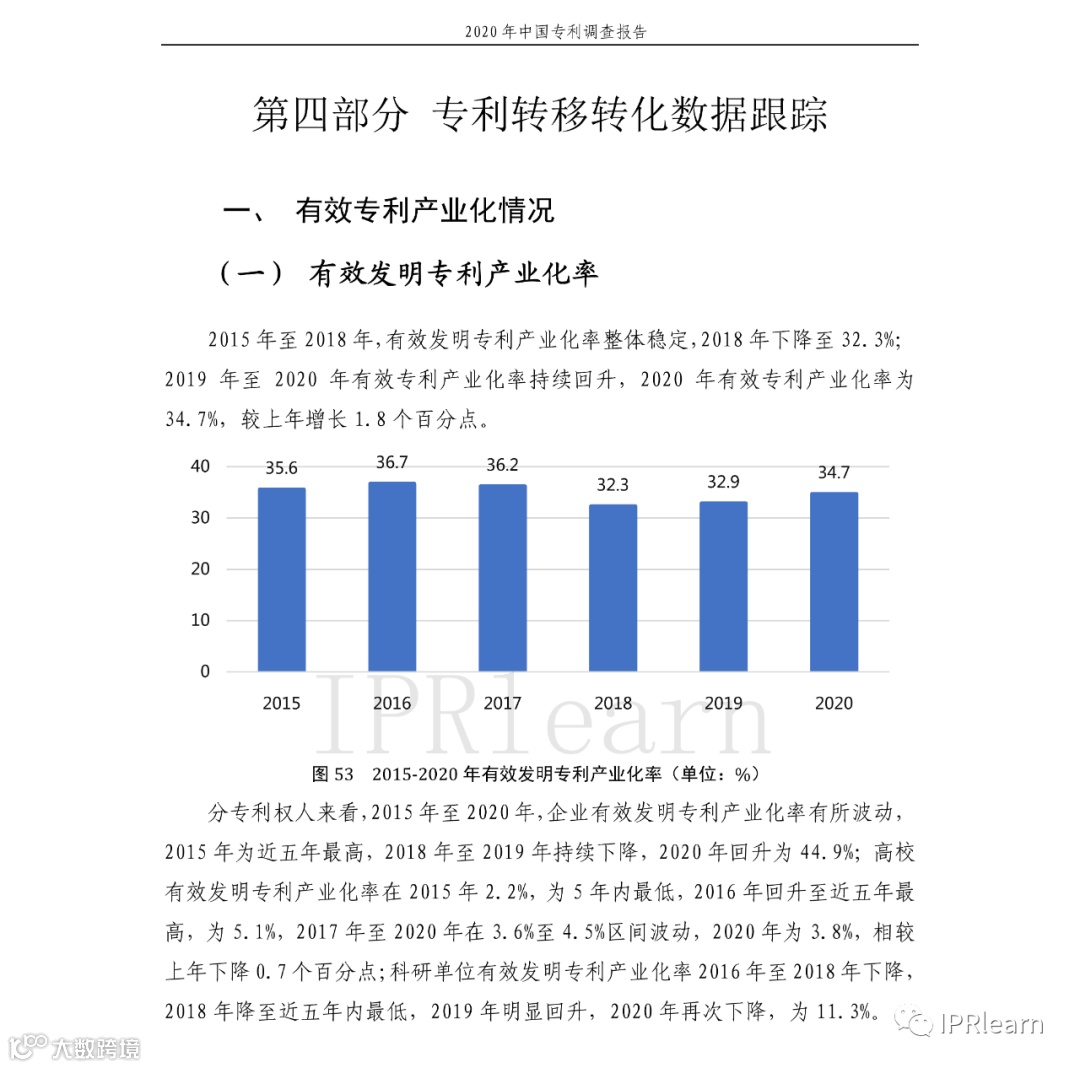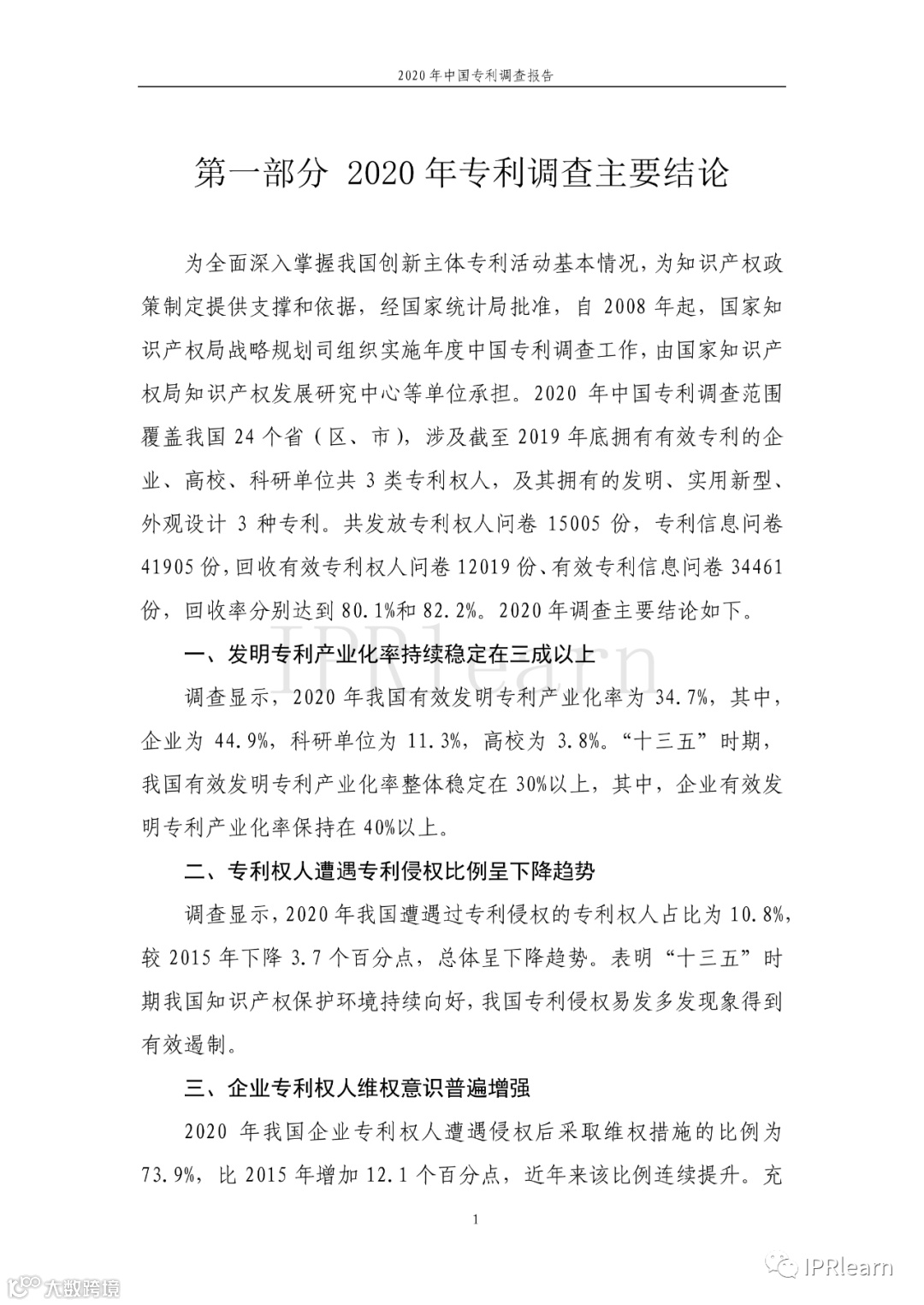 近日,国家知识产权局发布《2020年中国专利调查报告》(下文简称《报告》)。《报告》显示,2020年我国有效发明专利产业化率为34.7%,专利转移转化日趋活跃,专利保护成效显著、助力营商环境持续优化,专利研发投入较大提高、合作创新成为企业重要创新方式。调查主要结论如下: