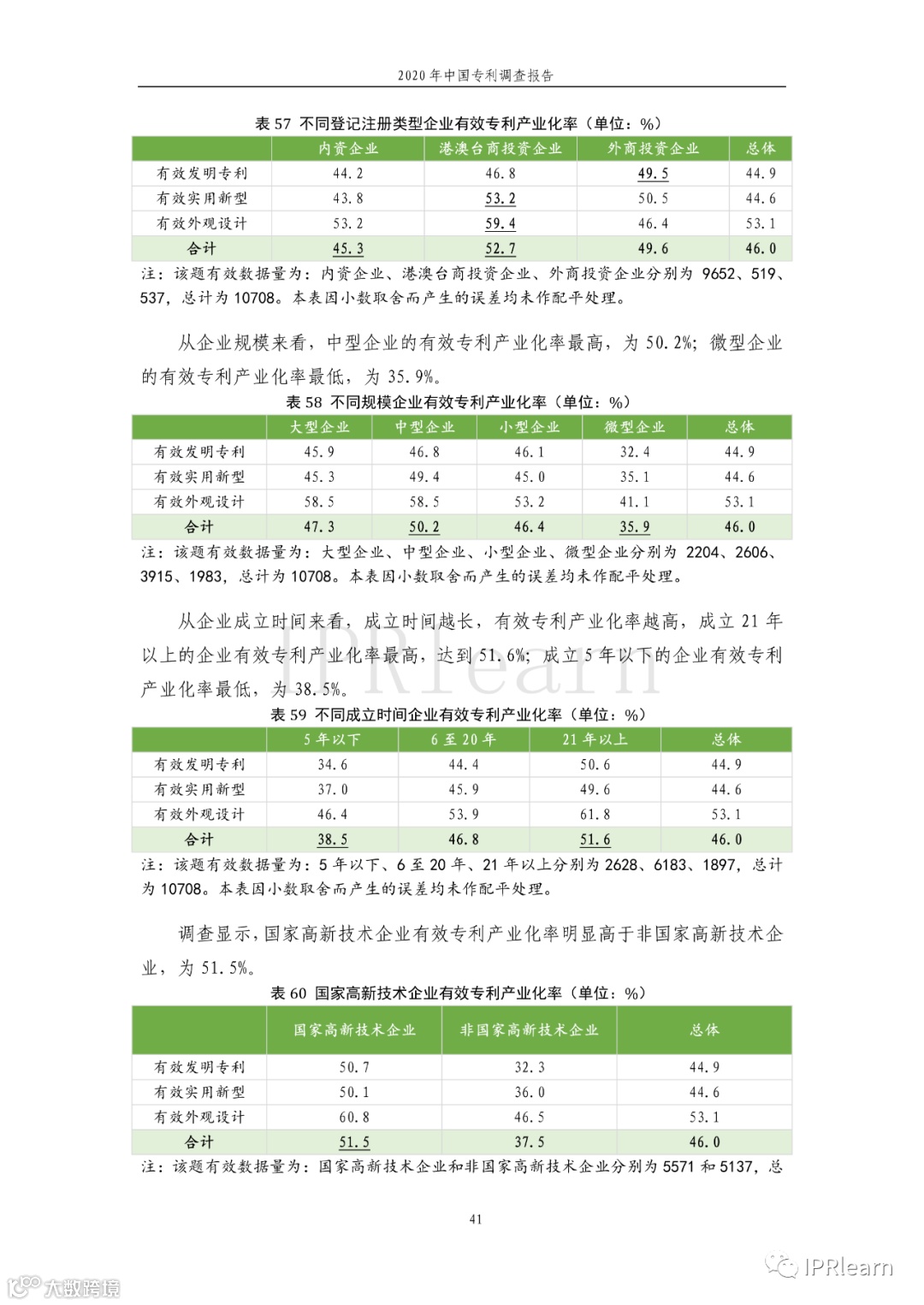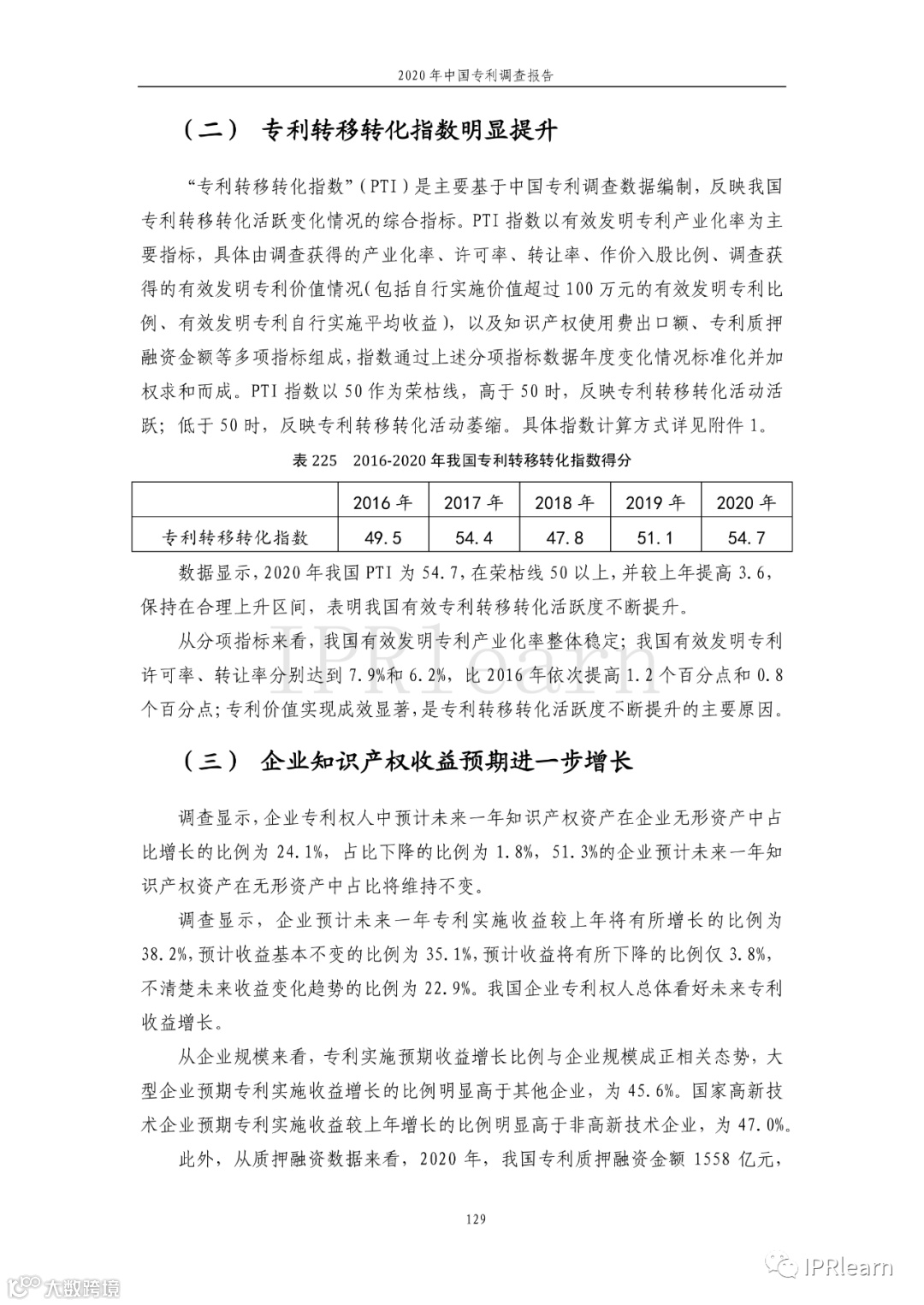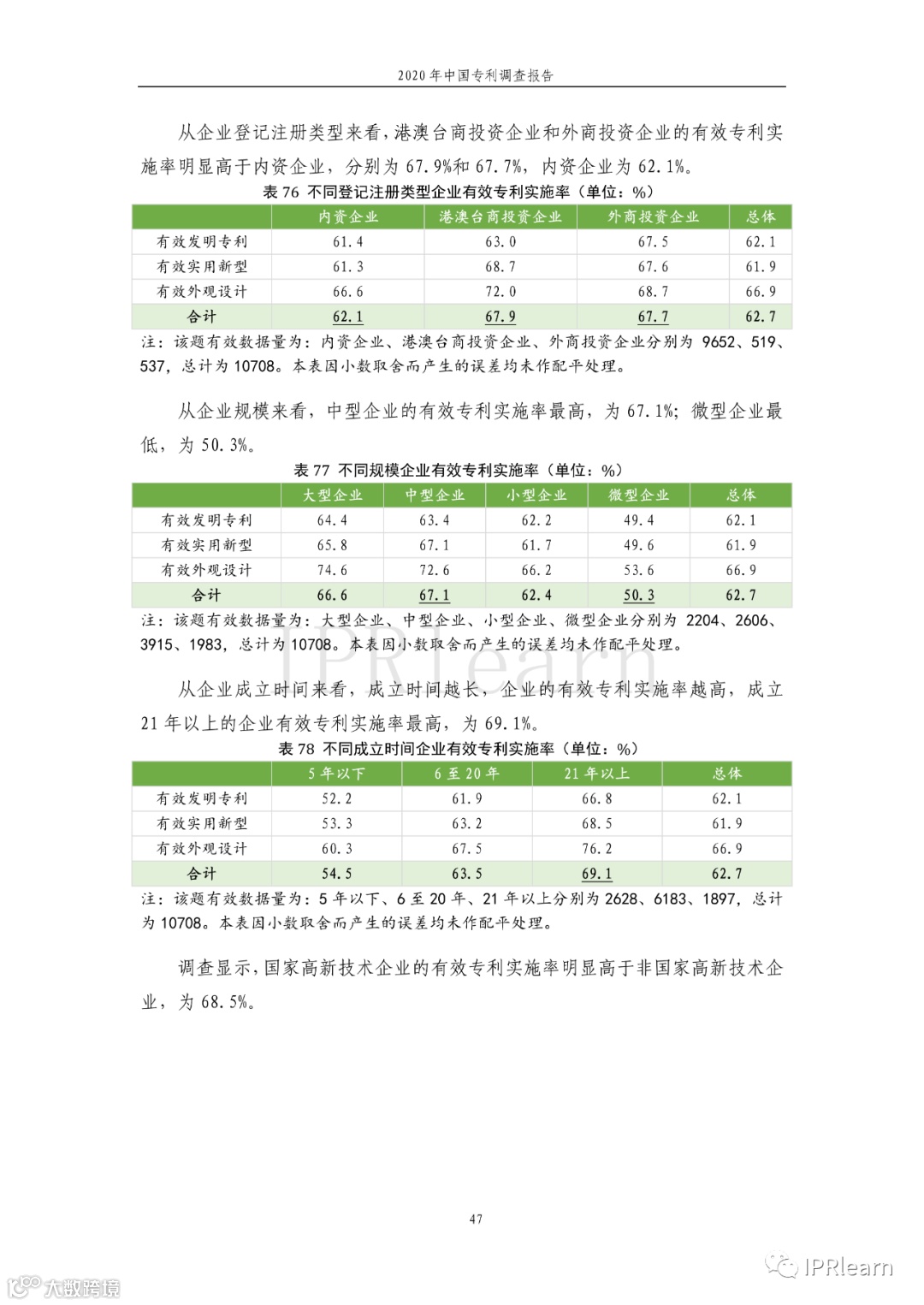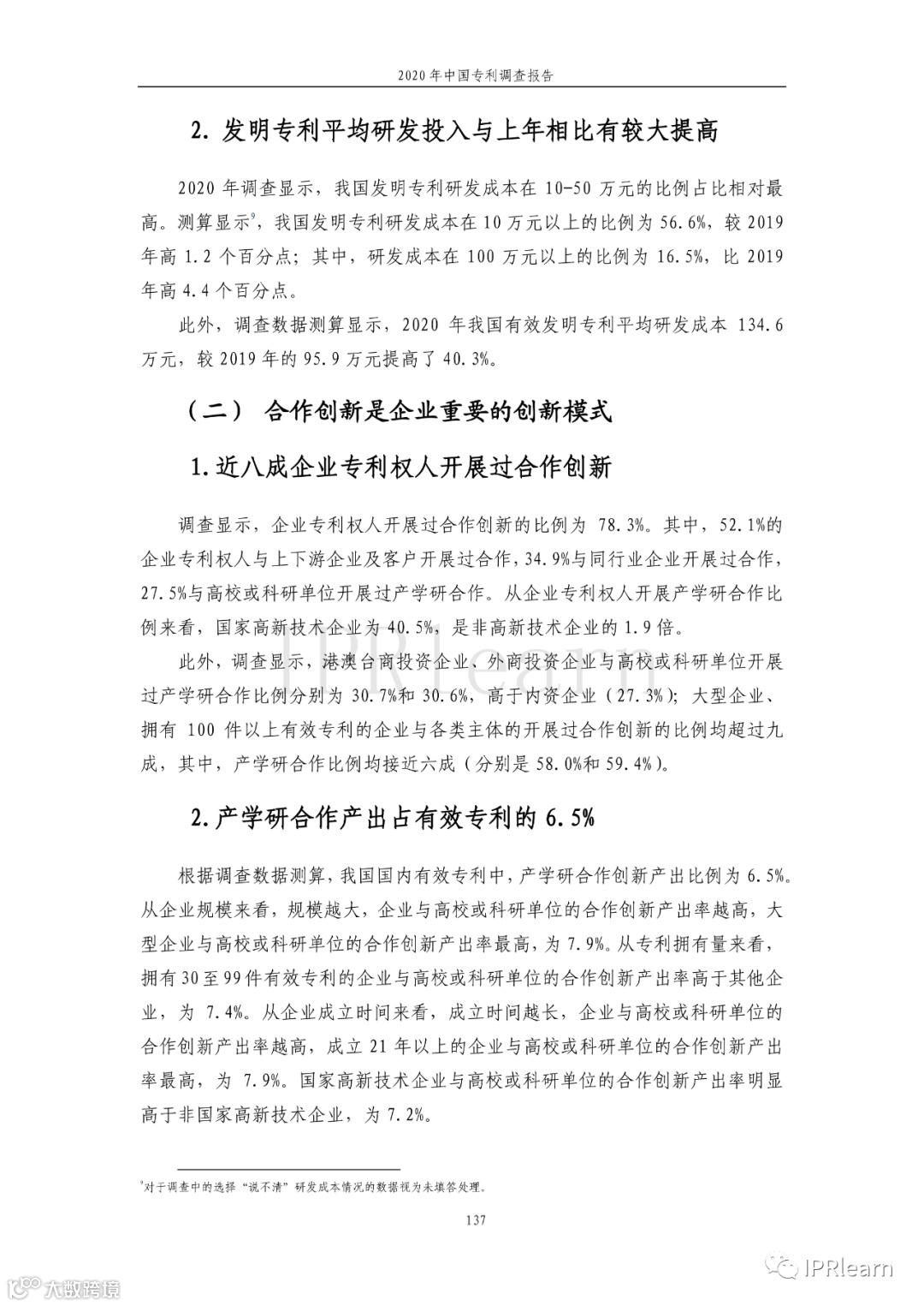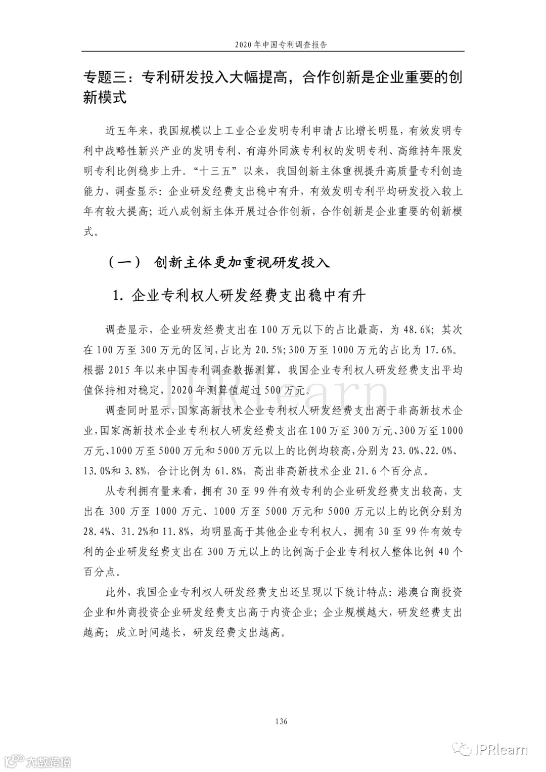 近日,国家知识产权局发布《2020年中国专利调查报告》(下文简称《报告》)。《报告》显示,2020年我国有效发明专利产业化率为34.7%,专利转移转化日趋活跃,专利保护成效显著、助力营商环境持续优化,专利研发投入较大提高、合作创新成为企业重要创新方式。调查主要结论如下: