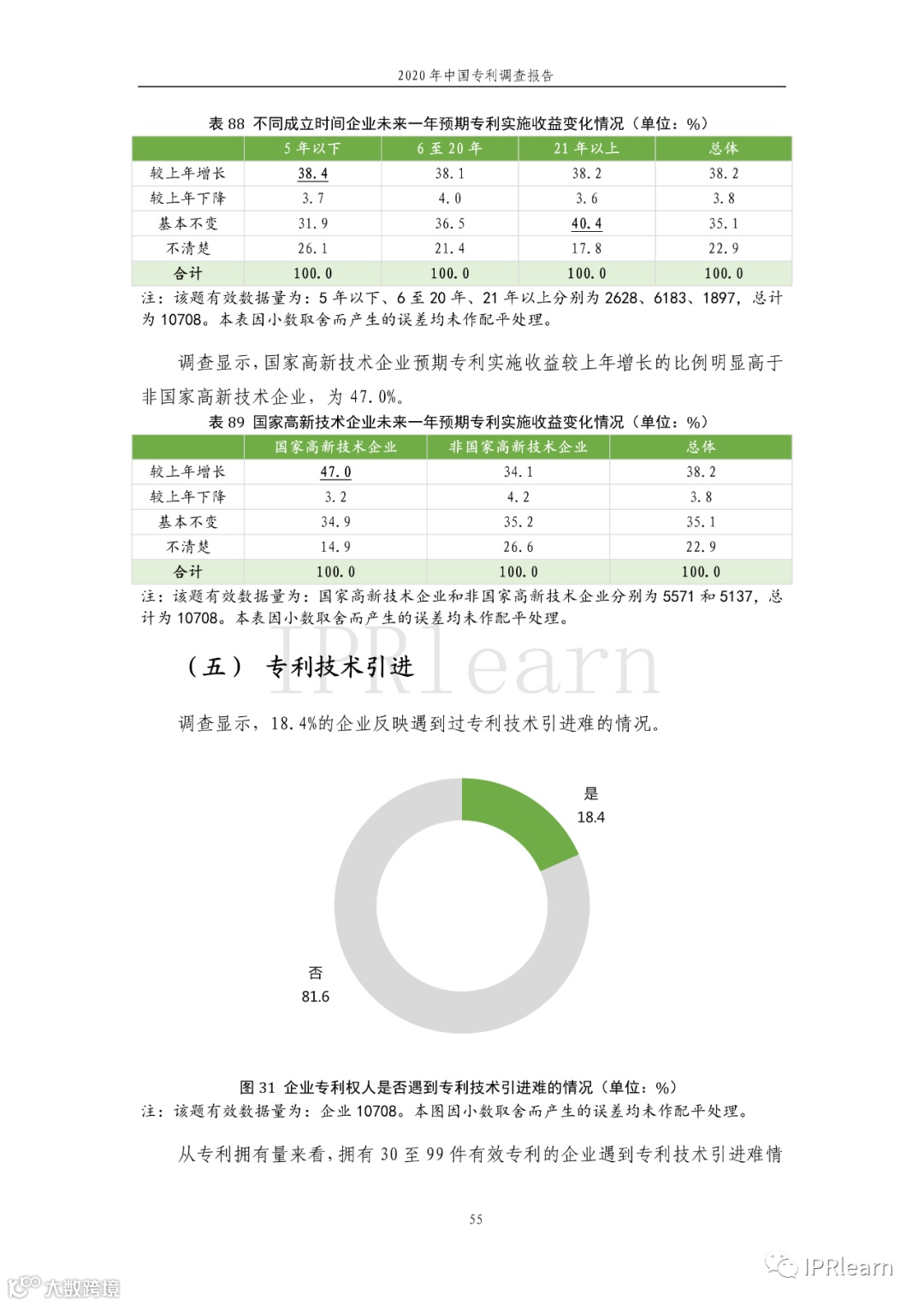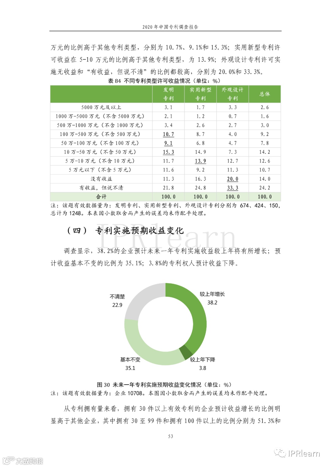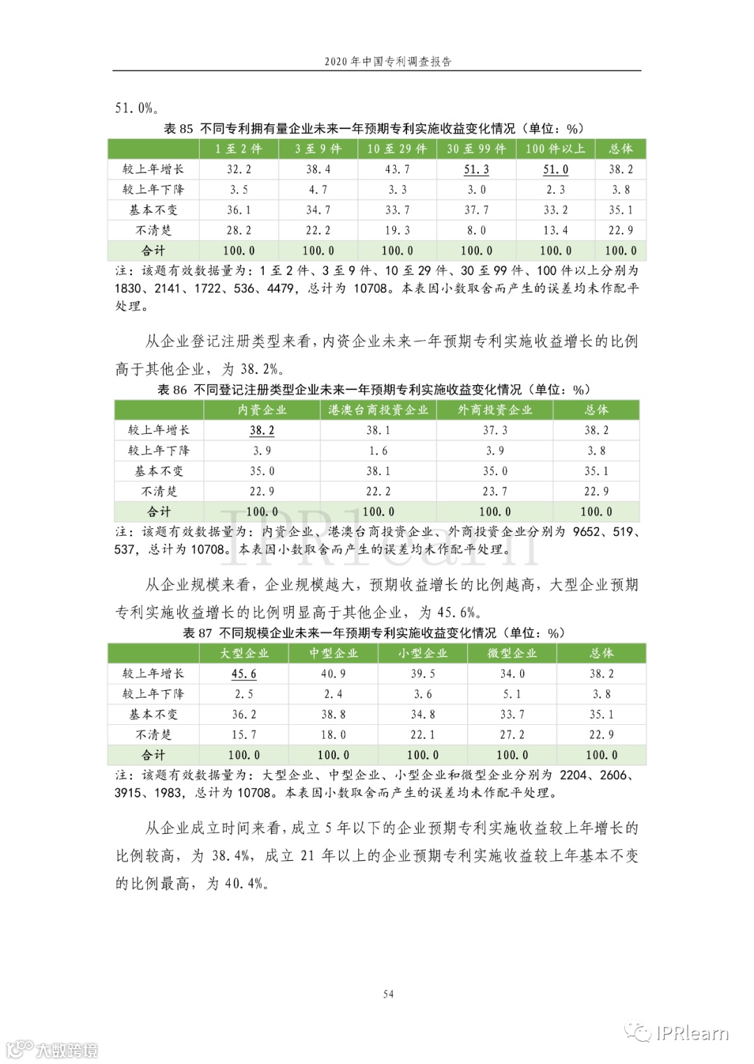 企业知识产权收益预期进一步增长。调查显示,近八成企业对未来专利收益情况有明确预期,在这些企业中,49.5%的专利权人预计未来一年专利实施收益将有所增长,45.5%预计收益基本不变,仅5.0%预计收益将有所下降。我国企业专利权人总体看好未来专利实施收益增长。