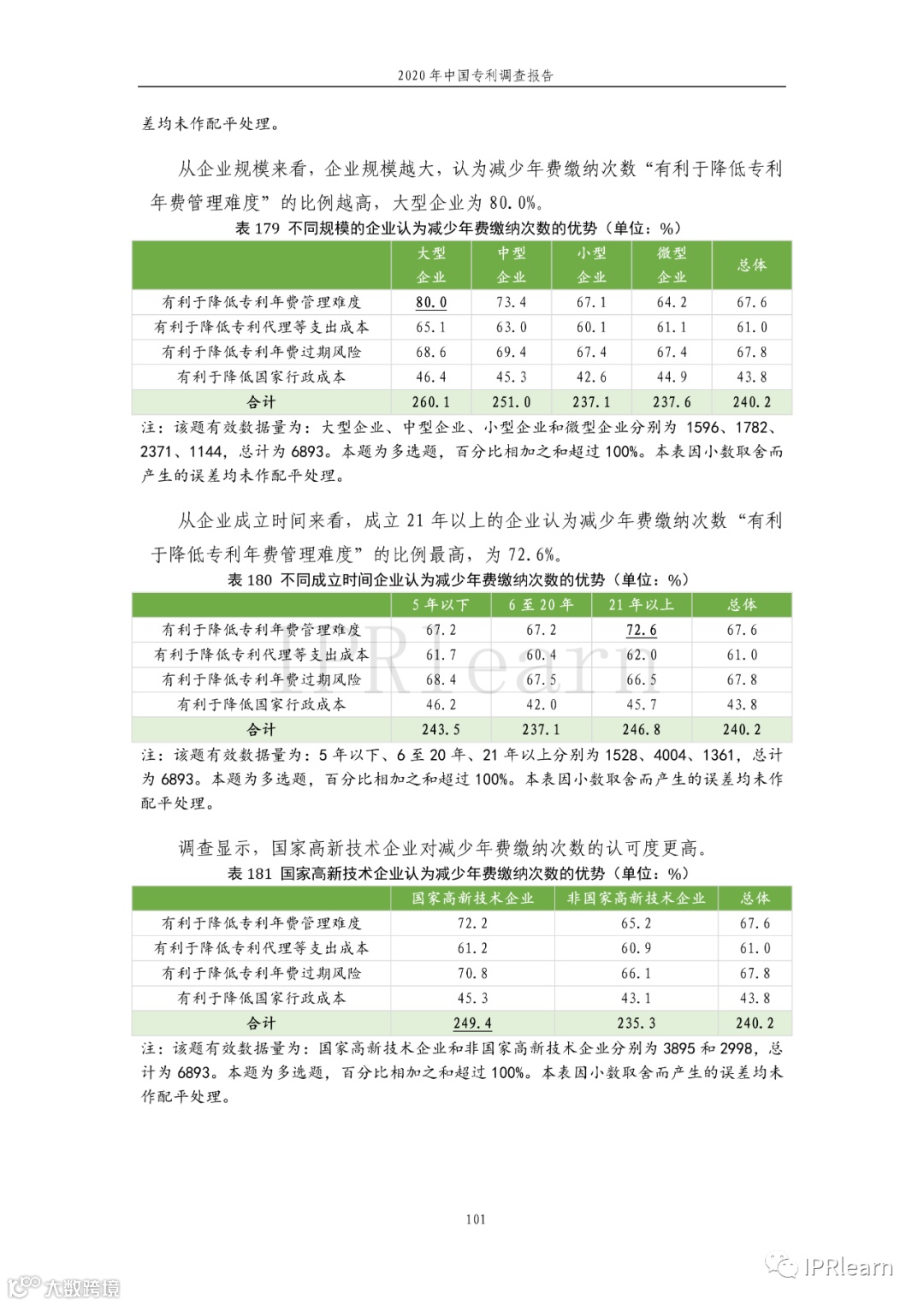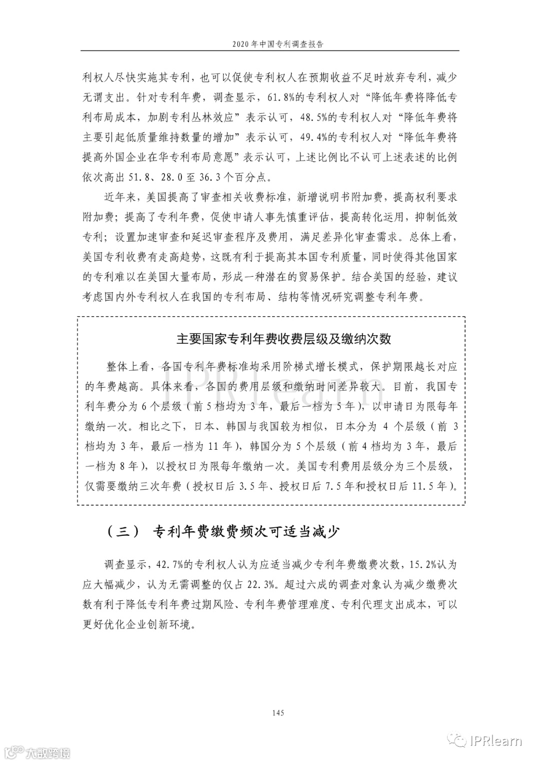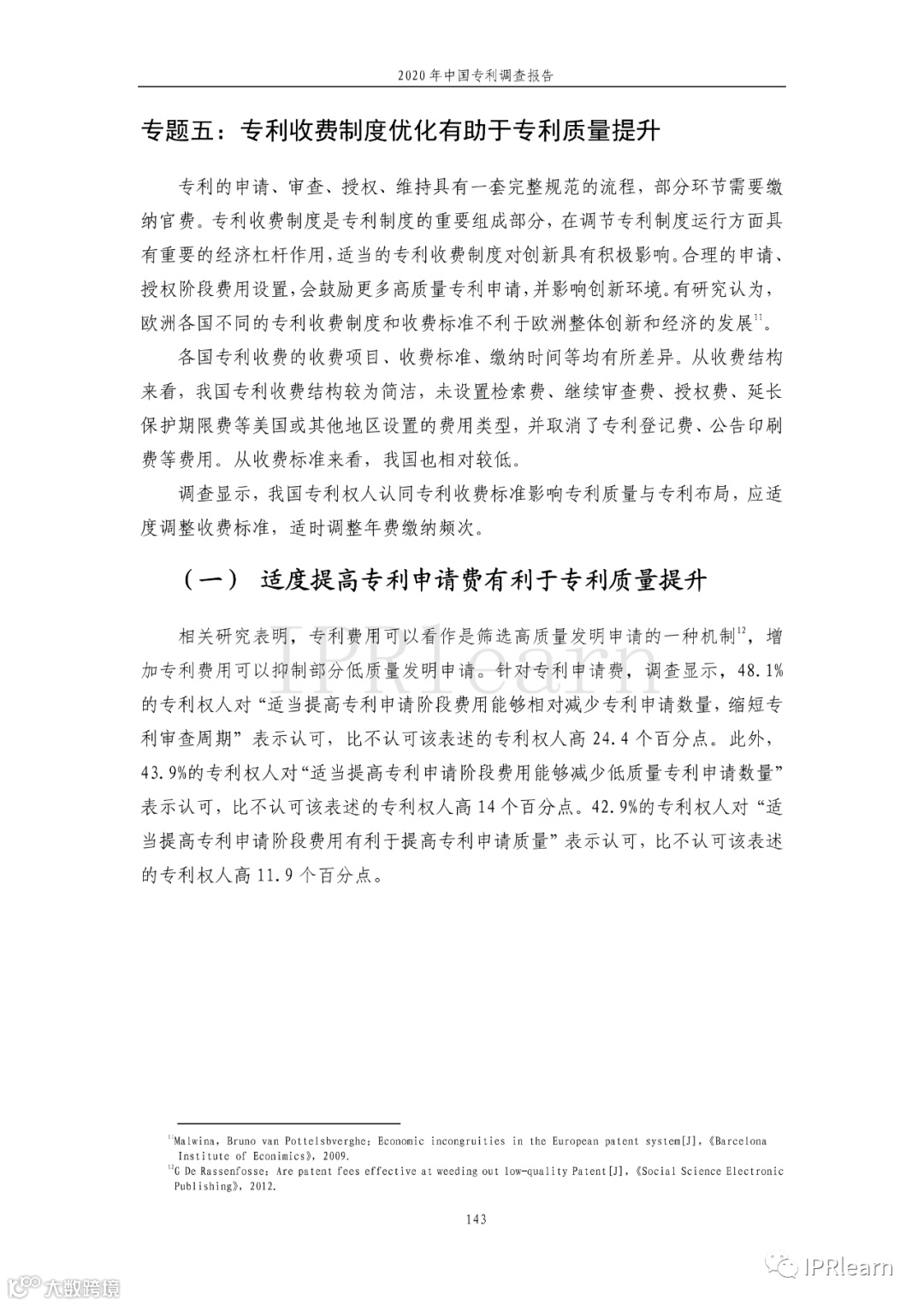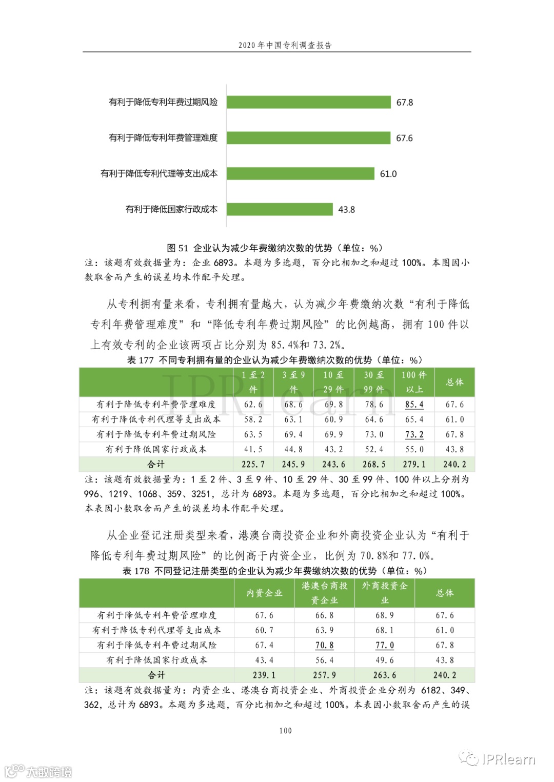 调节不同阶段的专利收费标准可以影响专利权人的专利行为。针对专利申请费,43.9%的专利权人认为“适当提高专利申请阶段费用能够减少低质量专利申请数量”,比不认可的高14个百分点。针对专利年费,61.8%的专利权人认为“降低年费将降低专利布局成本,加剧专利丛林效应”,比不认可的高51.8个百分点。