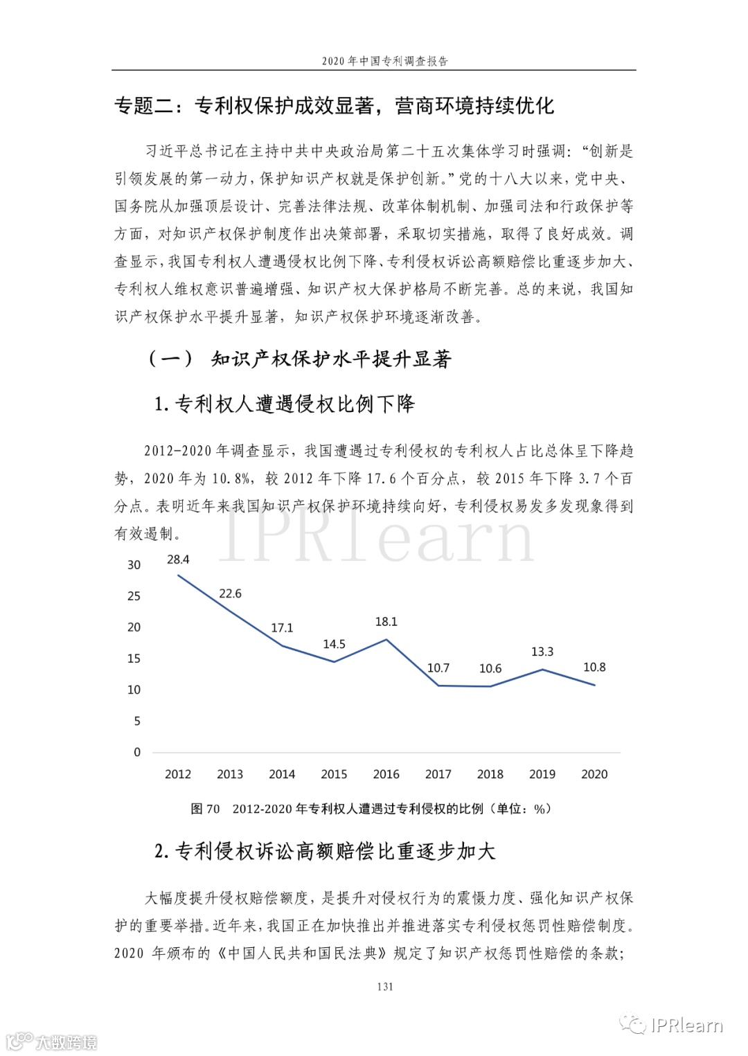 我国专利权人遭遇侵权比例呈下降趋势。2020年调查显示,我国专利权人遭遇专利侵权的比例为10.8%,较2015年下降 3.7个百分点,我国知识产权保护环境持续向好。