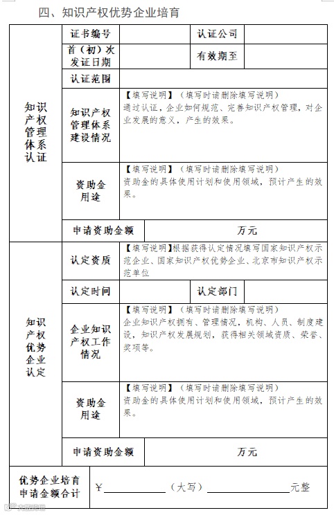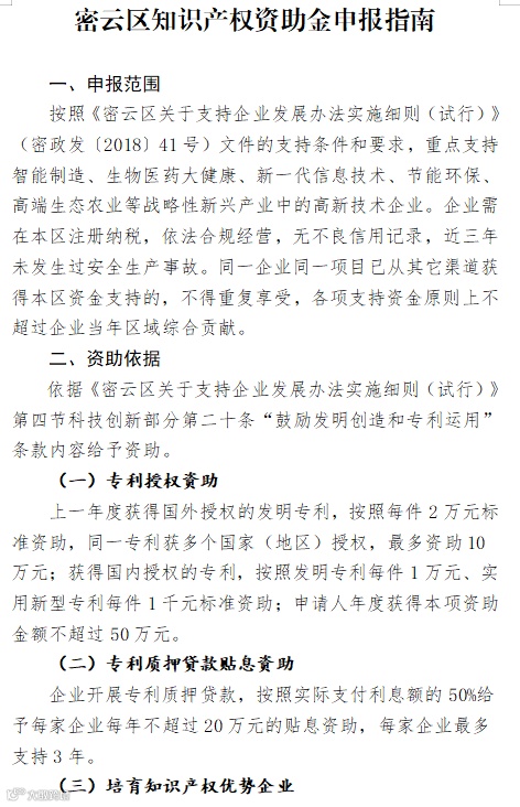 此次针对《密云区关于支持企业发展办法实施细则(试行)》中第四节科技创新部分第二十条“鼓励发明创造和专利运用”条款进行资助,请符合条件的申请人按照《密云区知识产权资助金申报指南》(附件1)的要求,填写《密云区知识产权资助金申报书》(附件2)做好申报工作。