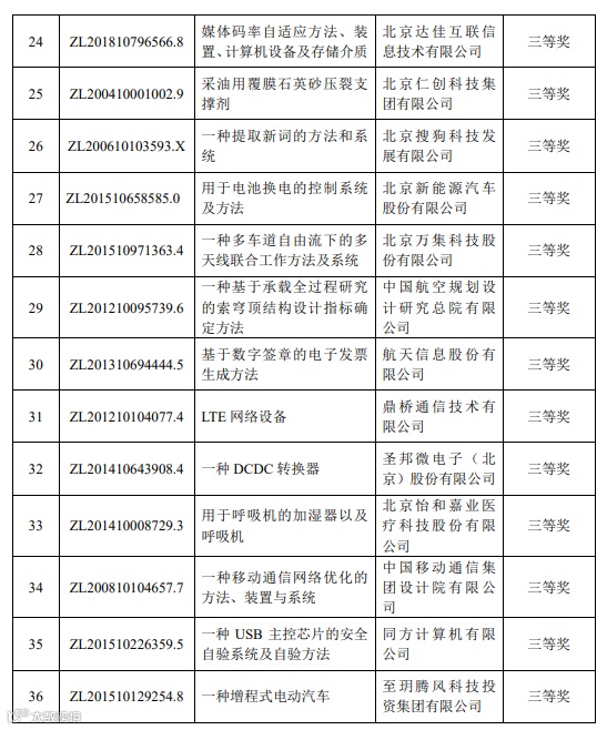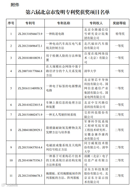根据《北京市发明专利奖励办法》(京政办发〔2007〕33号),经过规定程序评审并报请市政府批准,北京市知识产权局、北京市人力资源和社会保障局决定授予北京全路通信信号研究设计院集团有限公司的“一种轨道电路”发明专利为特等奖;授予北汽福田汽车股份有限公司的“一种电动汽车高压电气系统及控制方法”及其他单位的5项发明专利为一等奖;授予交控科技股份有限公司的“一种无人驾驶控制系统”及其他单位的10项发明专利为二等奖;授予中粮集团有限公司、中粮营养健康研究院有限公司、中粮屯河股份有限公司的“复合吸附剂以及使用该复合吸附剂脱除甜菜糖异味的方法” 及其他单位的20项发明专利为三等奖。