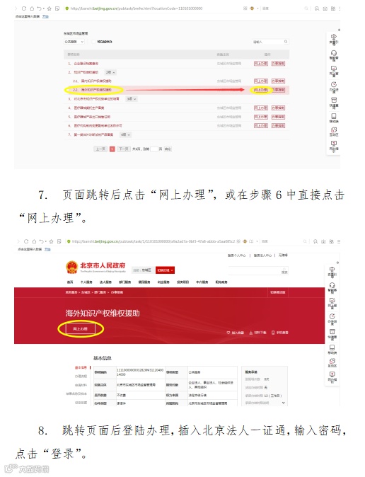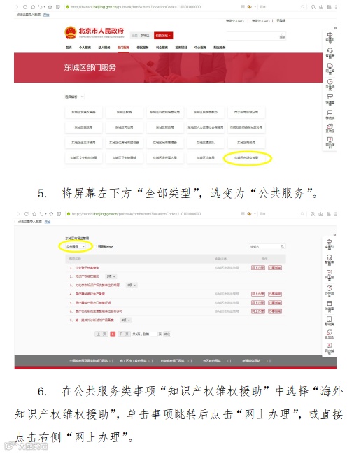 由知识产权服务机构登录“北京市政务服务网”(http:// banshi.beijing.gov.cn/),在企事业单位或社会组织所在地的区知识产权管理部门政务服务事项中的“海外知识产权维权援助”事项进行线上申报。