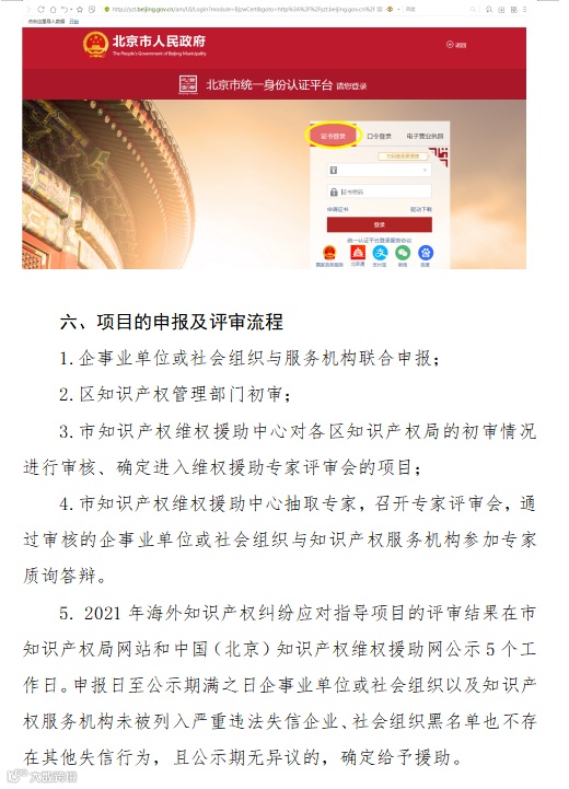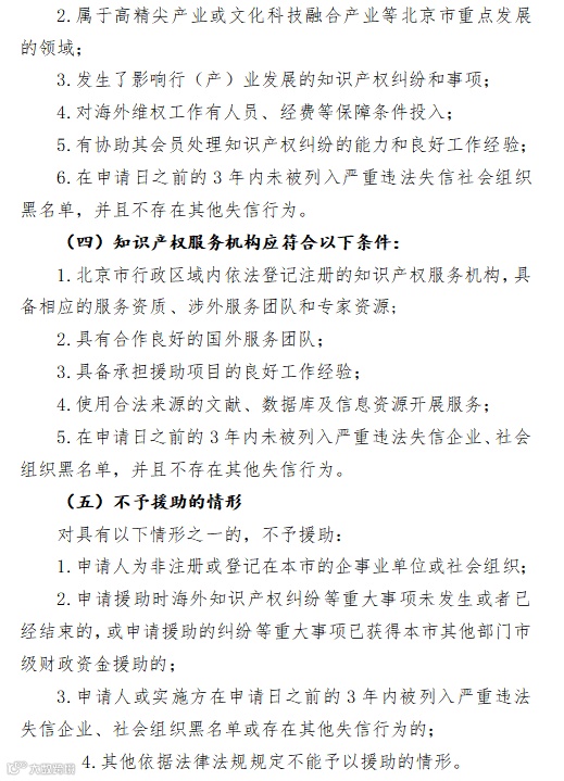 2021年海外知识产权纠纷应对指导项目的评审结果在市知识产权局网站和中国(北京)知识产权维权援助网公示5个工作日。申报日至公示期满之日企事业单位或社会组织以及知识产权服务机构未被列入严重违法失信企业、社会组织黑名单也不存在其他失信行为,且公示期无异议的,确定给予援助。