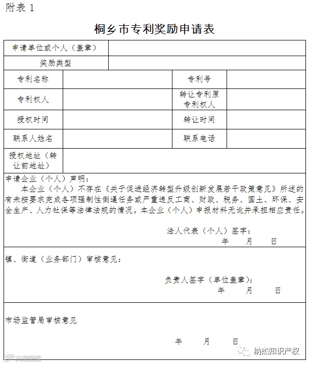 附表:1、桐乡市专利奖励申请表;