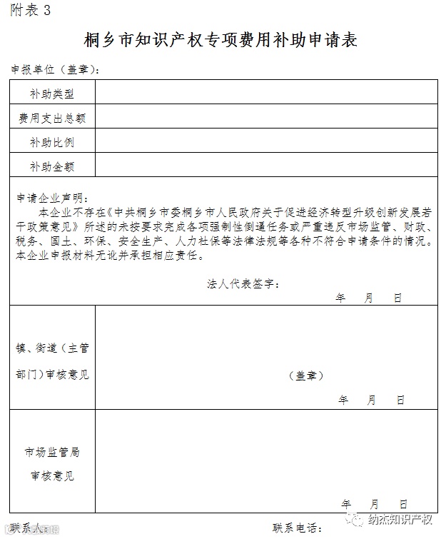 3.桐乡市知识产权专项费用补助申请表;