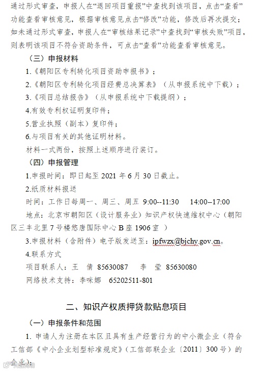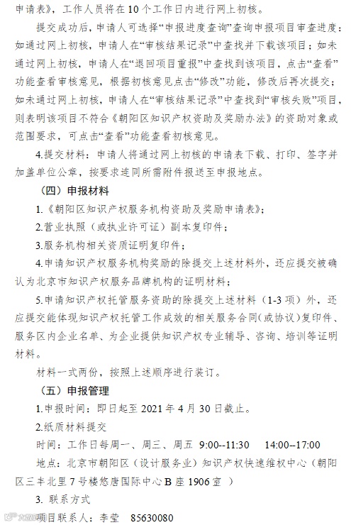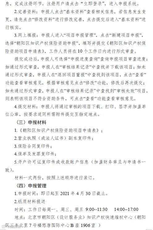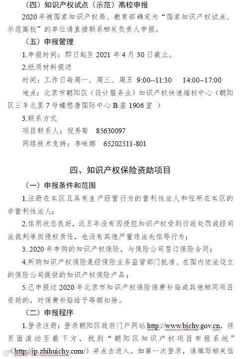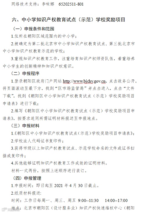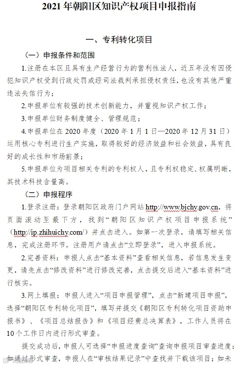 为充分发挥知识产权在推进科技进步与经济发展中的支撑作用,根据《朝阳区知识产权资助及奖励办法》(京朝市监发〔2020〕88号)、《北京市朝阳区知识产权运营服务体系建设专项资金管理办法》(京朝市监发〔2020〕81号)的规定,现面向区内企(事)业单位开展2021年知识产权项目征集工作,请各单位按照申报指南(见附件)要求申报。