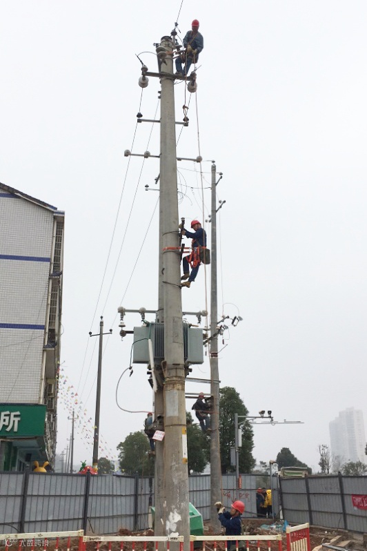 项目前期已完成新建环网柜安装、电缆管线下地敷设、架空线敷设、新立电杆和杆变台架基础安装,当天的停电工作重点是对道路旁的3台变压器移位、拆除在四条道路上跨度565米、长1710米的退运架空线和电杆。