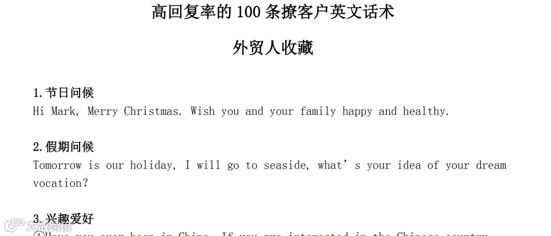 我们在触达客户的时候,新客户,老客户,有时候可能不知道如何聊天,而这100条聊客户的话术,可以帮我们找到很多不同的灵感,话题,对我们业务过程有着很重要的作用。
