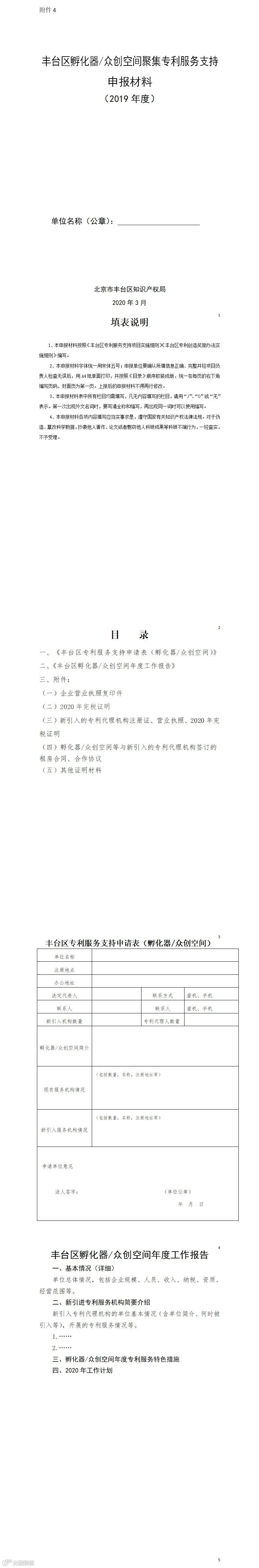 附件4:丰台区孵化器众创空间聚集专利服务支持申报材料(2019年度);